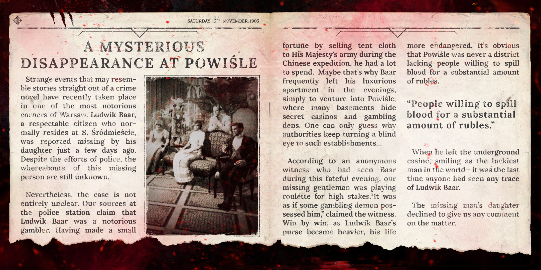 Nevertheless, the case is not entirely unclear. Our sources at the police station claim that Ludwik Baar was a notorious gambler. Having made a small fortune by selling tent cloth to His Majesty's army during the Chinese expedition, he had a lot to spend. Maybe that’s why Baar frequently left his luxurious apartment in the evenings, simply to venture into Powiśle, where many basements hide secret casinos and gambling dens. One can only guess why authorities keep turning a blind eye to such establishments…