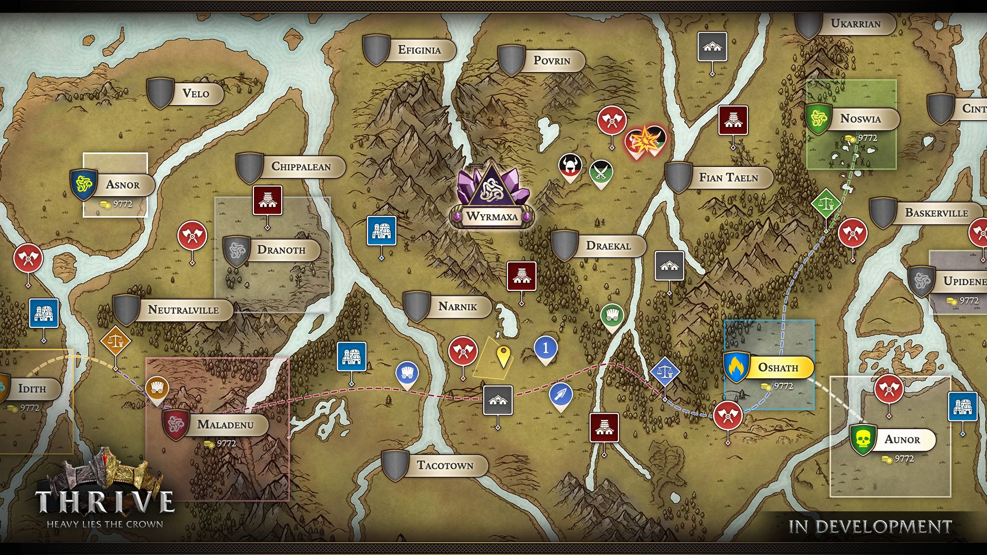 Players looking to establish new friendships throughout Nysamor can examine the Strategic Map to locate nearby AI towns. By selecting a town on the map, players can gain insight into its current status. This includes its alignment (neutral/Wyrmaxan, Benevolent, Tyrannical), allies, needs (requests), and available resources.