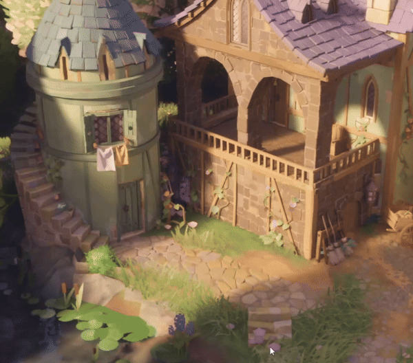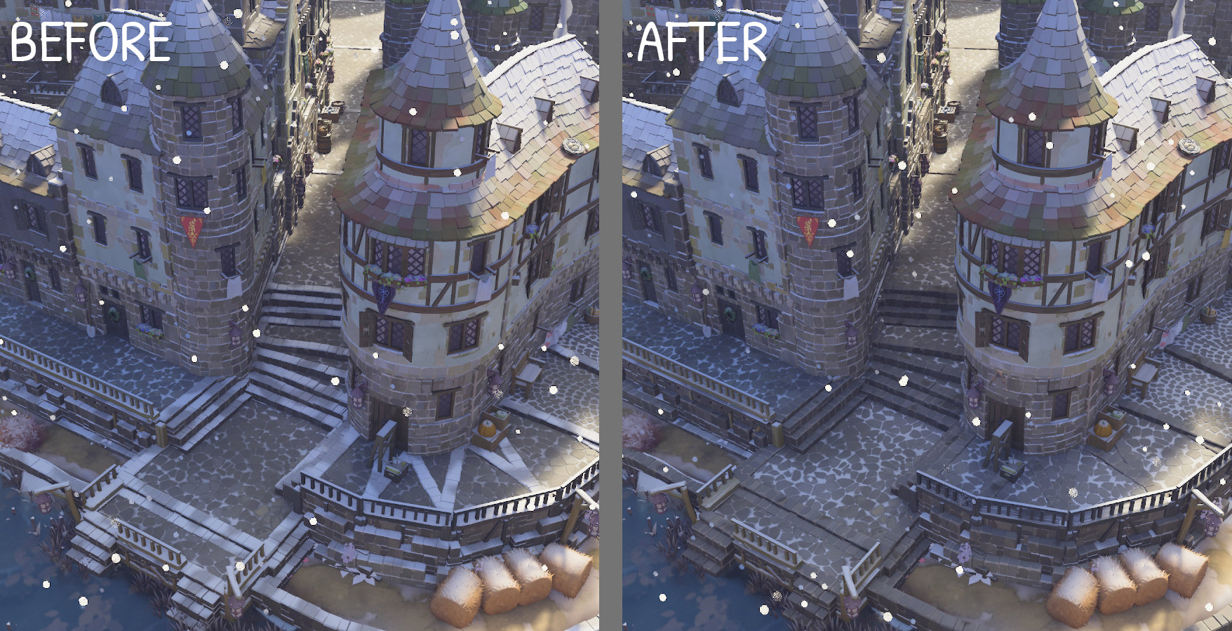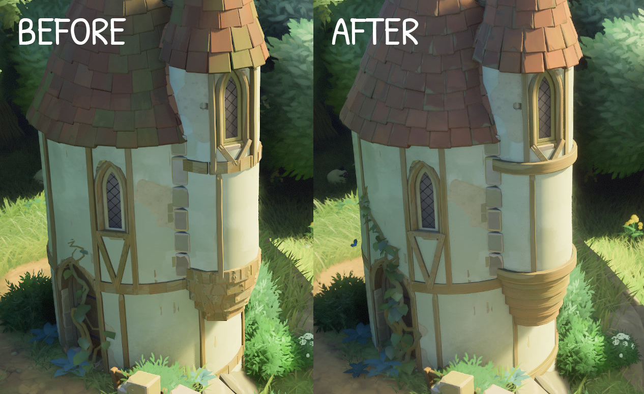 Timbering on towers has received a visual uplift too! They're no longer made out of small wooden pieces (which could look broken in certain configurations), but instead are one continuous curved wooden beam. The roof tiles have also been upgraded to have more detail.