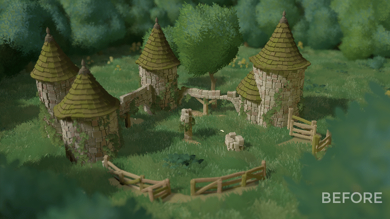 Previously everything had its own lighting calculations, so the planks in a fence reacted to light differently than the pillars, the bricks, and so on. They all lived in their own tiny universes with different laws of physics ???? This gave us control in a single lighting situation, such as noon, but made it hard to achieve a pleasing look across all times of day.