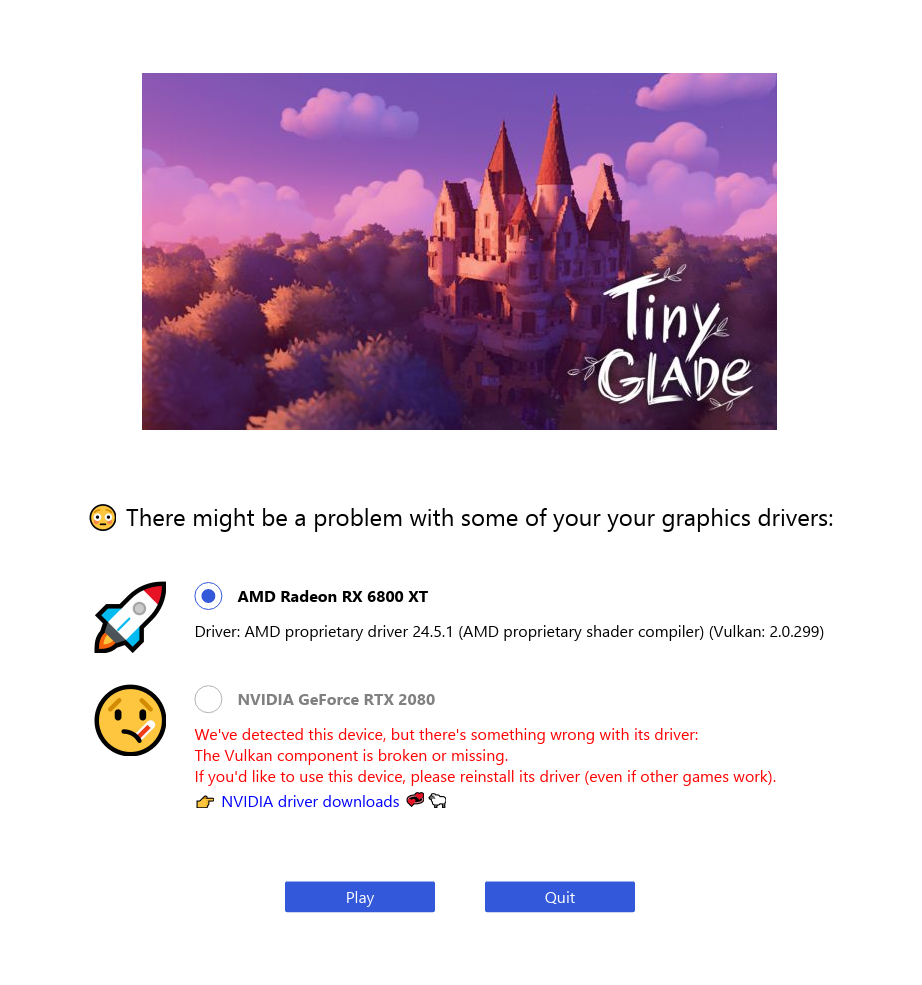 - [i](Windows)[/i] The missing NVIDIA graphics cards have been found. We've noticed that sometimes players have faulty Vulkan graphics drivers. When this occurs, other games might work fine if they use Direct3D, but Tiny Glade couldn't see any cards using those drivers. We now use DXGI (DirectX Graphics Infrastructure) to find the missing cards, and report that their drivers need to be reinstalled.