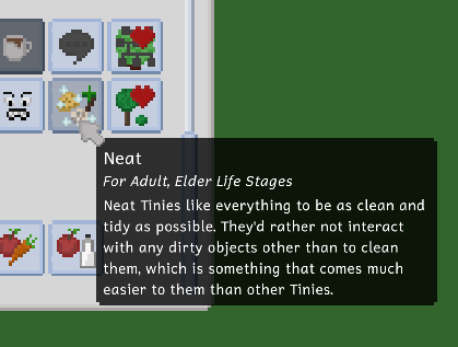 The Neat personality, which is the third new one added in this update, is not socialization-related at all, and instead improves Tinies' ability and interest in cleaning and keeping the house nice and tidy. Maybe there's a negative to being that neat here and there, though...