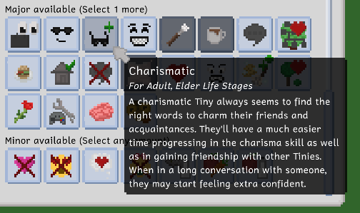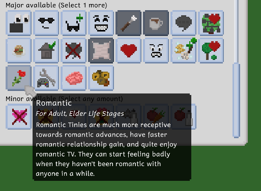 As we said at the top, this update also includes two new personalities, both of which are fully featured major personalities that include new behaviors, social actions and a bit of additional gameplay. The first two new personalities are Charismatic and Romantic, which are essentially friendship- and romance-related versions of the same idea: Tinies with one or both of these personalities will have improved relationship gain in their respective categories, faster skill gain in the Charisma skill, and a few unique interactions and emotions available.