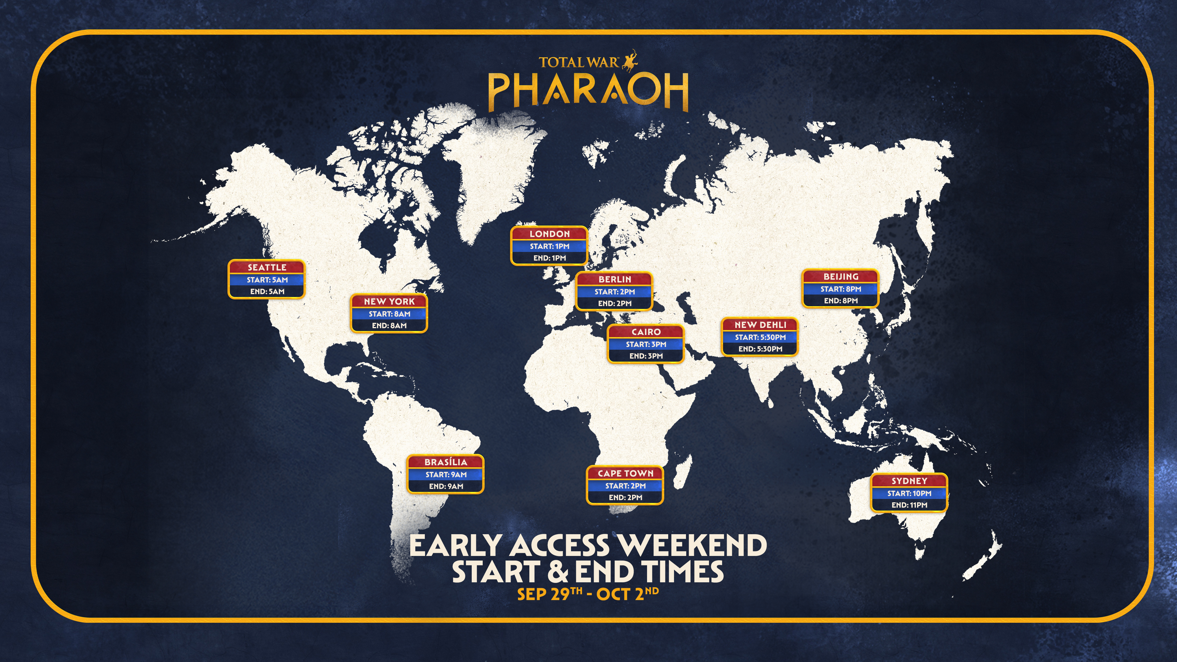 The [i]Total War: PHARAOH[/i] Early Access Weekend is almost upon us! Here are the global times for everyone. ????
