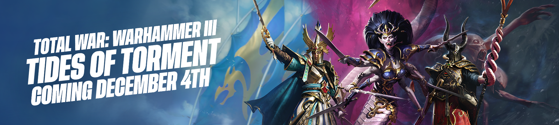 The time has come to reveal that our next Total War: WARHAMMER III DLC, Tides of Torment, arrives on December 4th! This pack includes a terrifying trio of Legendary Lords for the High Elves, Slaanesh and Norsca, and it will be released alongside Update 7.0, which introduces new battle units, campaign features and narrative, free content, and tweaks and fixes for all owners of the game.