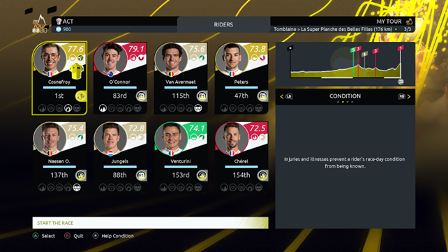 As far as rider performance is concerned, a new setting is being introduced this year: “Preparation”. The goal of this new option is to make the race results a bit more surprising than usual. When this option is enabled, some of the riders will be in better condition than usual, and, conversely, some will perform less effectively. To add variety, this option can affect any rider in the peloton.