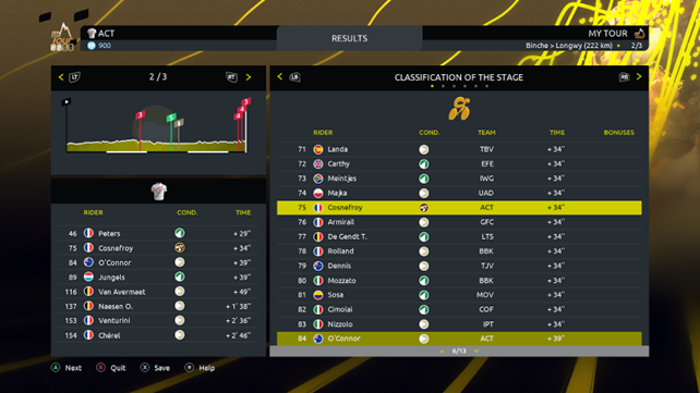 Now, though, when your rider falls and depending on your initial settings, an injury might result and the rider might be forced to withdraw (or, like before, be able to set off again with no consequence other than losing time). In the event of withdrawal, you must continue the race with another rider from your team. In the event of injury, the rider continues the race, but the maximum effort is limited. The extent of the limit depends on how serious the injury is. A slight injury has a minor effect on the maximum effort for a few minutes, while a serious injury prevents the rider from attacking and has consequences that extend beyond the current stage. Even though riders automatically recover between stages, the most serious falls have effects that last several days.