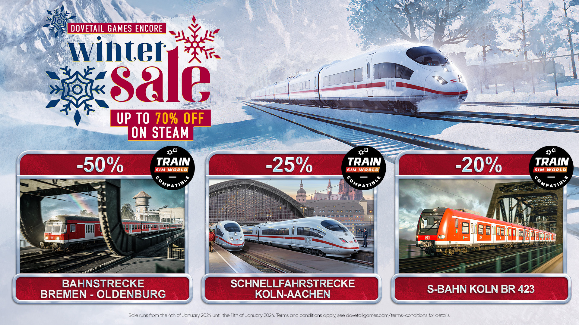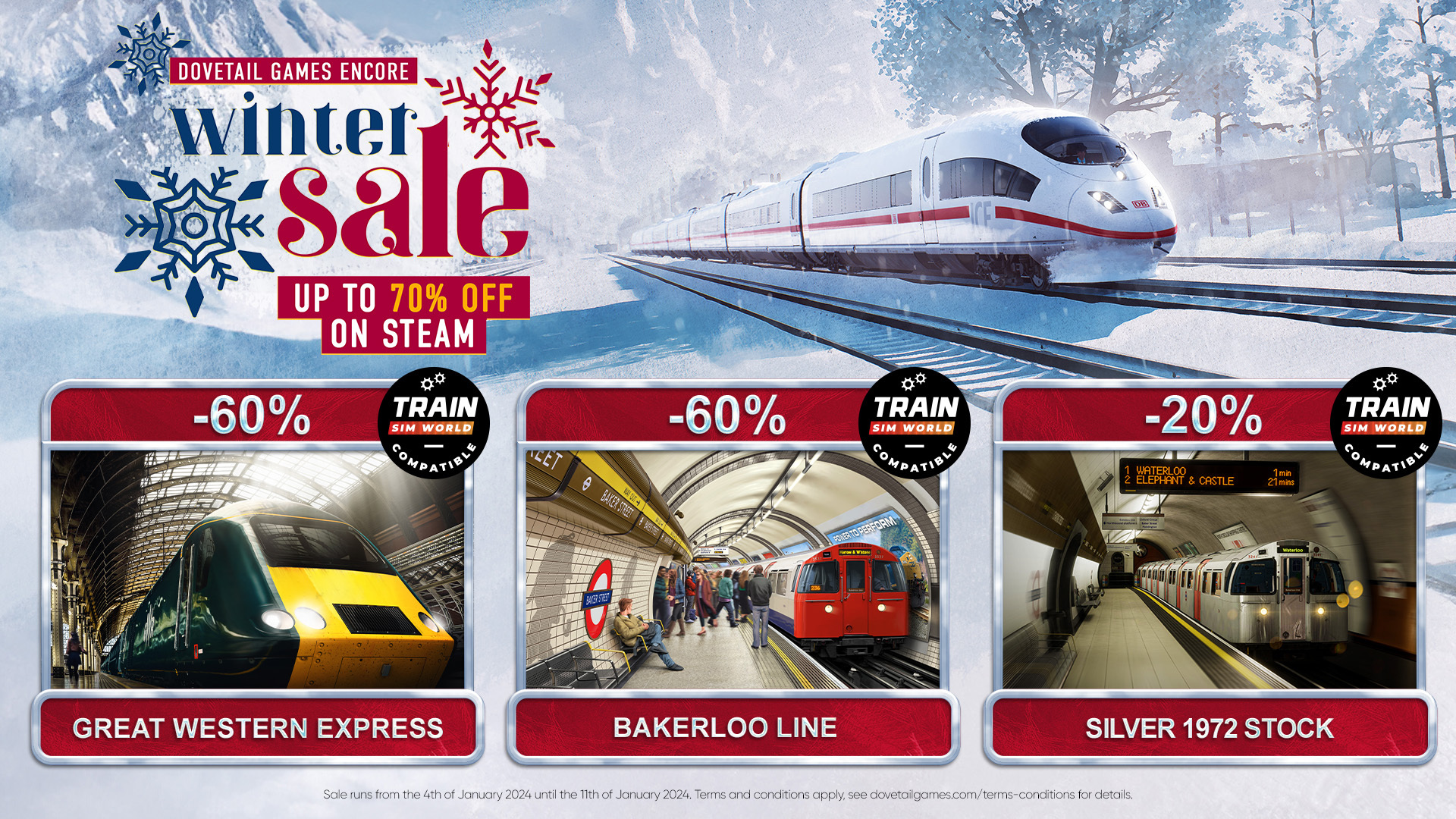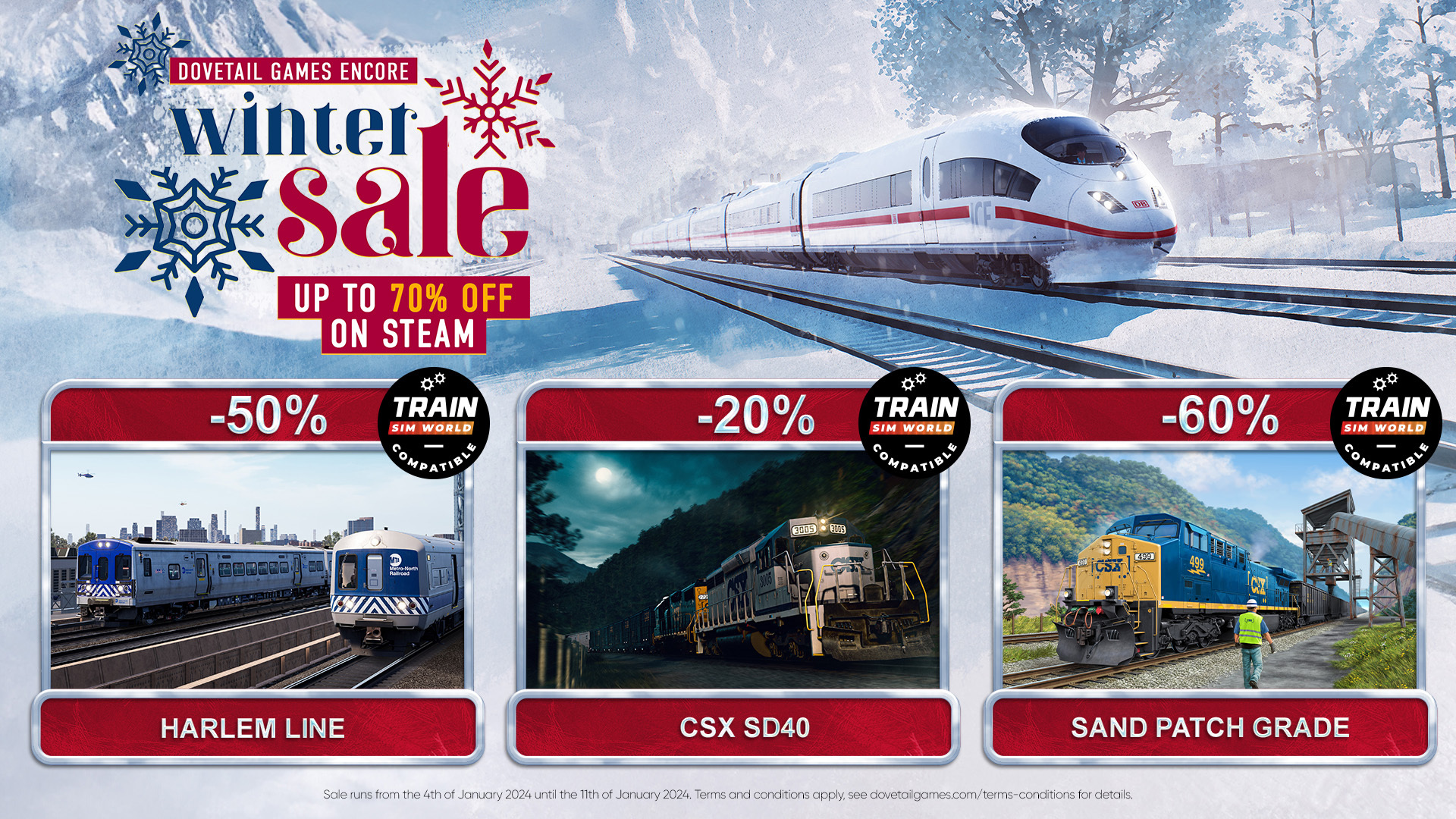 It's 2024! Happy New Year! And what better way to kick things off than with another sale on the Steam Store. Dovetail Games Presents: [url=https://store.steampowered.com/franchise/tswofficial][b]Winter Encore Sale[/b][/url], with discounts on Train Sim World routes and locomotives.