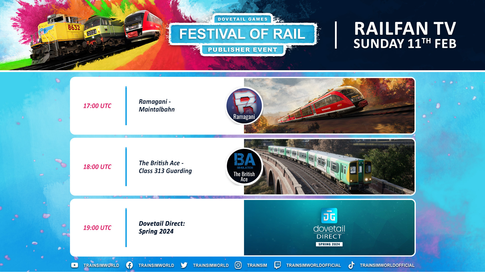 Catch our streams and follow our socials by following @trainsimworld on [b][url=https://twitter.com/trainsimworld]Twitter[/url][/b], [b][url=https://www.instagram.com/trainsim/]Instagram[/url][/b], [b][url=https://www.facebook.com/trainsimworld]Facebook[/url][/b], [b][url=https://www.youtube.com/user/RailSimulatorDotCom]YouTube[/url][/b], [b][url=https://www.twitch.tv/trainsimworldofficial]Twitch[/url][/b], and [b][url=https://www.tiktok.com/@trainsimworldofficial]TikTok[/url][/b]