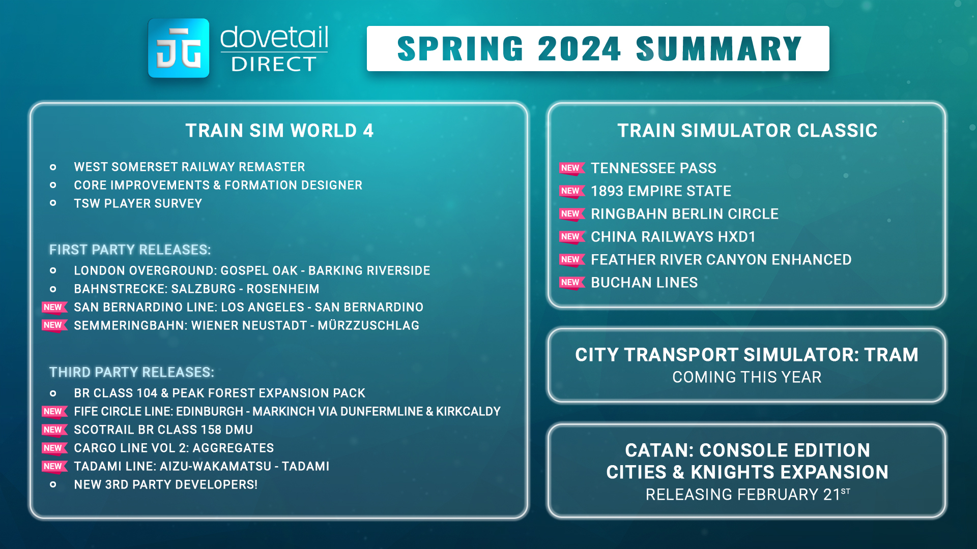As a reminder, we didn’t have a Roadmap stream this month with the Dovetail Direct taking its place, so we’ll be live Tuesday evening to talk about the new TSW4 announcements above and to answer your questions across any other areas you’ll want to hear more about. Be sure to submit your questions in advance on our [url=https://forums.dovetailgames.com/threads/february-roadmap-q-a-tuesday-feb-13th.78632/][b]Latest Q&A thread.[/b][/url] And that’s it! Quite enough excitement for a Sunday evening, we hope you’ll agree. We’ll catch you live on Tuesday to answer your questions, and we hope you’re as excited for the next few months of content as we are![b]Dovetail Direct: Spring 2024 Summary[/b]