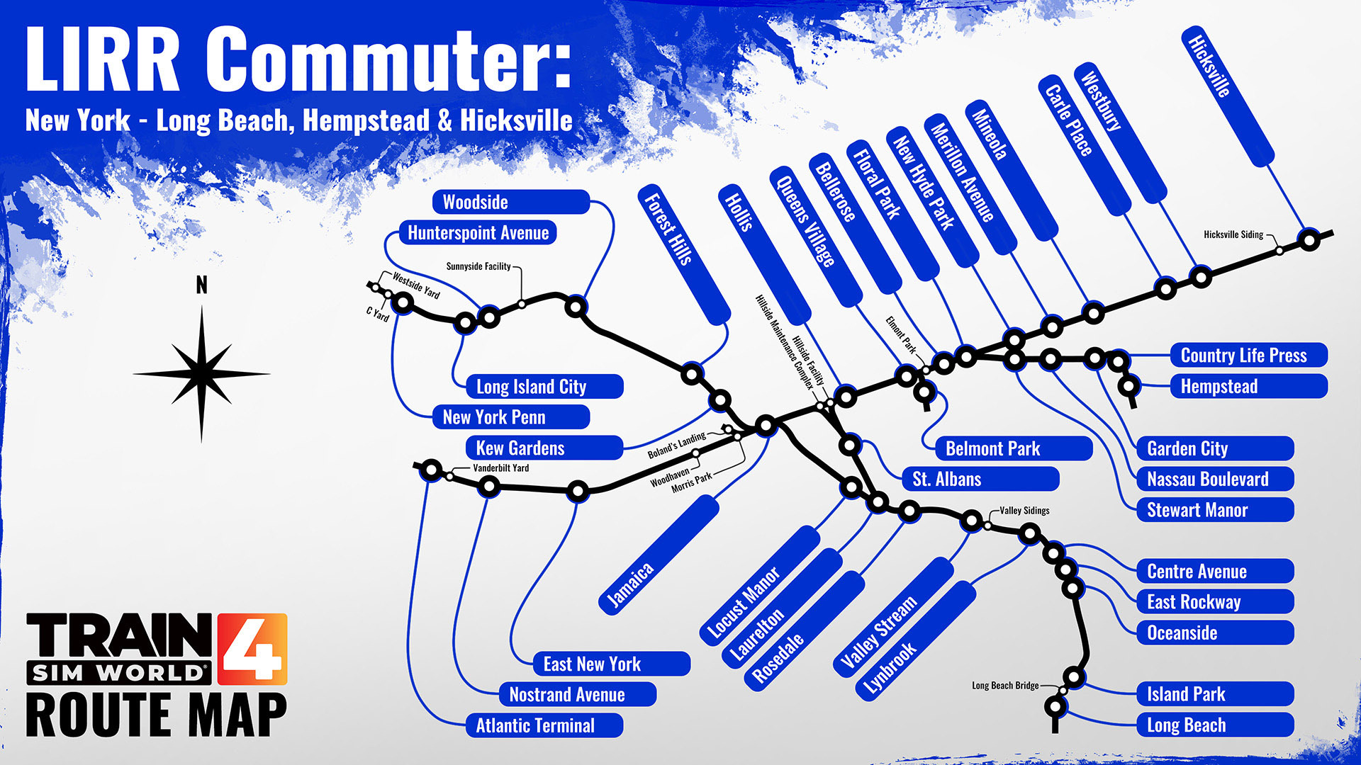 The route encompasses the entire[b] Long Beach[/b] and [b]Hempstead[/b] branches as well as the [b]Main Line[/b] to Hicksville and the [b]Atlantic Branch[/b] to Atlantic Terminal allowing for the busy network to run populated with a full schedule of services.