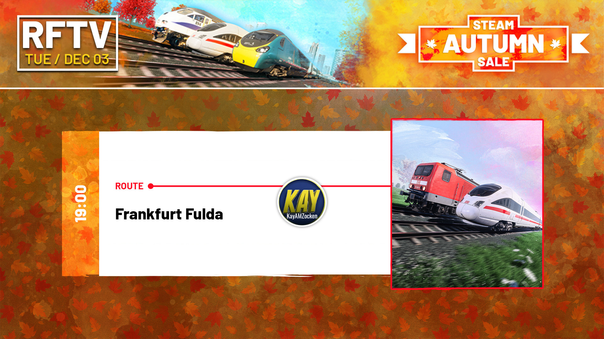 We are continuing the celebration of our Autumn Sales with new ambassador creator content! Coming up later tonight, Tuesday December 3rd, from 19:00 UTC, will be our German host KayAMZocken on Frank-furt Fulda Kinzigtalbahn. Find out more about Train Sim World 5 by following @trainsimworld on [b][url=https://twitter.com/trainsimworld]X/Twitter[/url][/b], [url=https://bsky.app/profile/trainsimworld.bsky.social][b]Bluesky[/b][/url], [b][url=https://www.instagram.com/trainsim/]Instagram[/url][/b], [b][url=https://www.facebook.com/trainsimworld]Facebook[/url][/b], [b][url=https://www.youtube.com/user/RailSimulatorDotCom]YouTube[/url][/b], [b][url=https://www.twitch.tv/trainsimworldofficial]Twitch[/url][/b], and [b][url=https://www.tiktok.com/@trainsimworldofficial]TikTok[/url][/b].