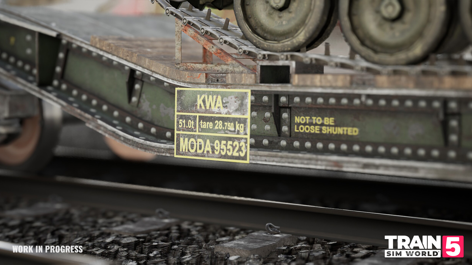 The wagon consists of a main spine with multiple container locking points between two wheeled bogies. Conventional draw gear and buffers are located at one end, with a permanent connecting bar at the other for linking with a twin. These wagons feature dynamic container load so that no two trains are the same (in-game, some wagons in formations have been preselected not to be loaded).