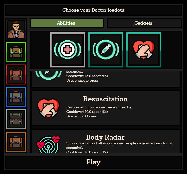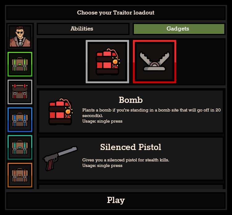 But even that's not all, either! We are also introducing a brand new [b]Gadget[/b] system. With many of the abilities we've added, we realized that you can very clearly divide all abilities into two categories: something physical (such as the Bomb as Traitor) and something abstract, like a skill that you can learn (such as Doctor Resuscitate, because we imagine it as CPR.) So with the new Gadget system, we have divided the abilities into those two categories. Abilities are now things that you can do however many times you want (minus the cooldown) and that don't depend on any external device, basically like your skills. Gadgets on the other hand, are tools with limited quantity, that can be used whenever you want and however many times you want with no cooldown. There's many to choose from, so we hope you enjoy them!