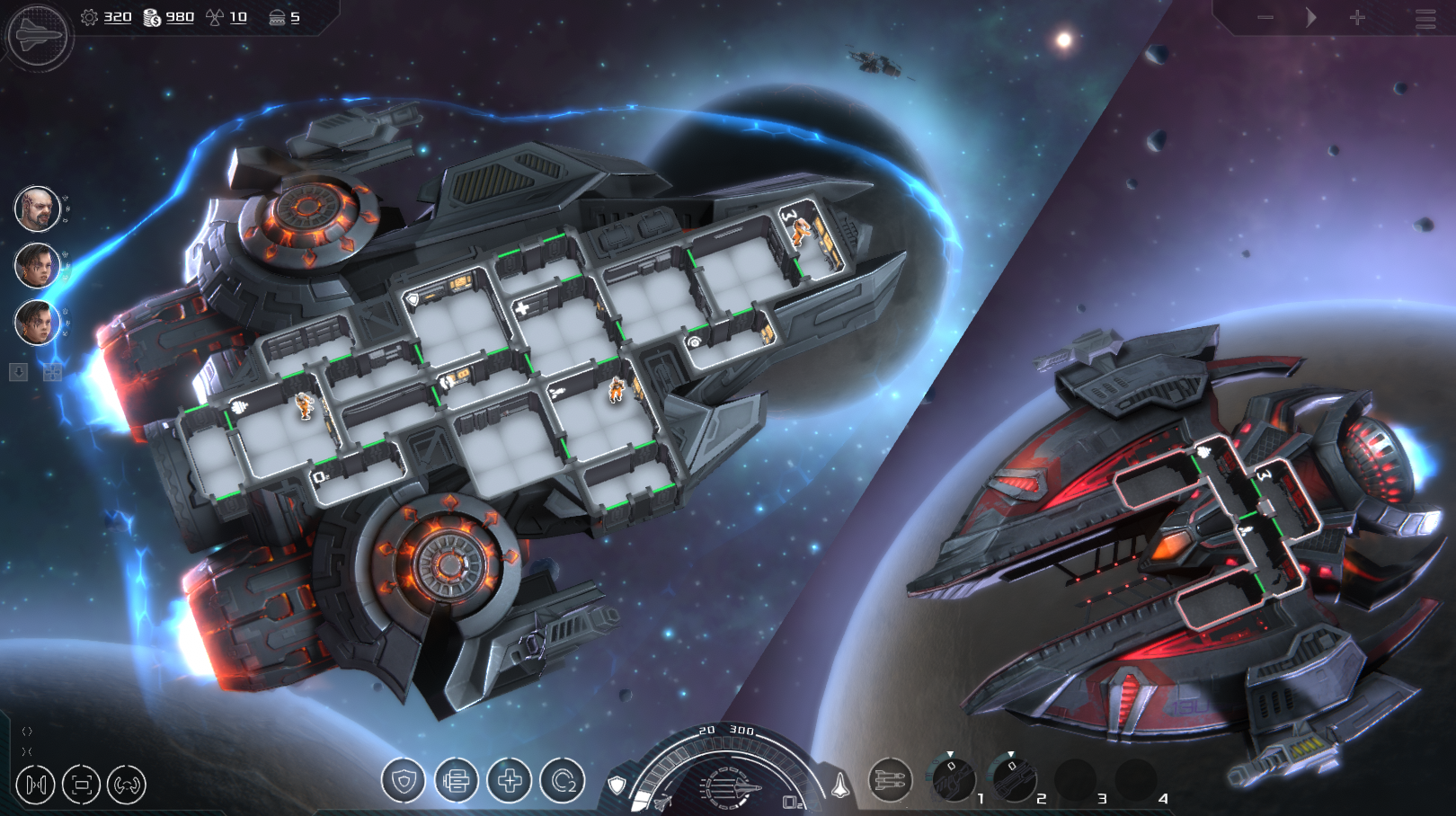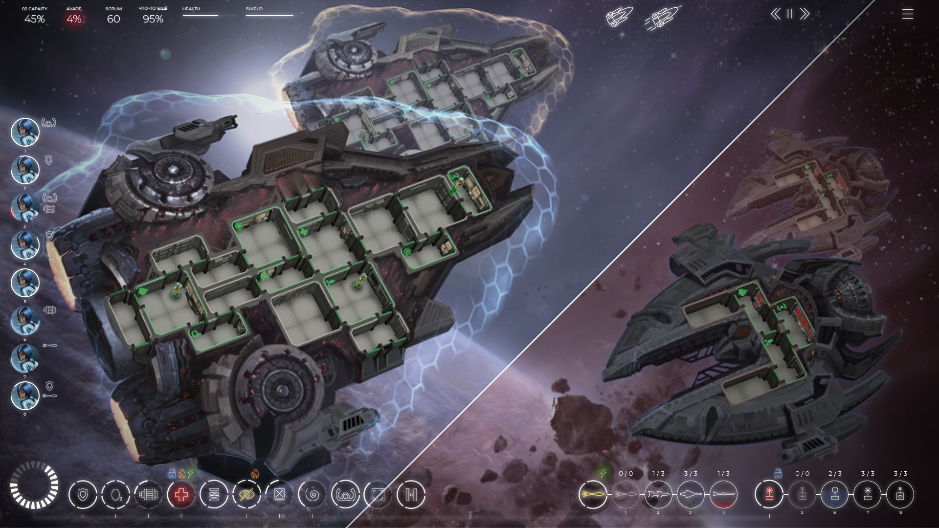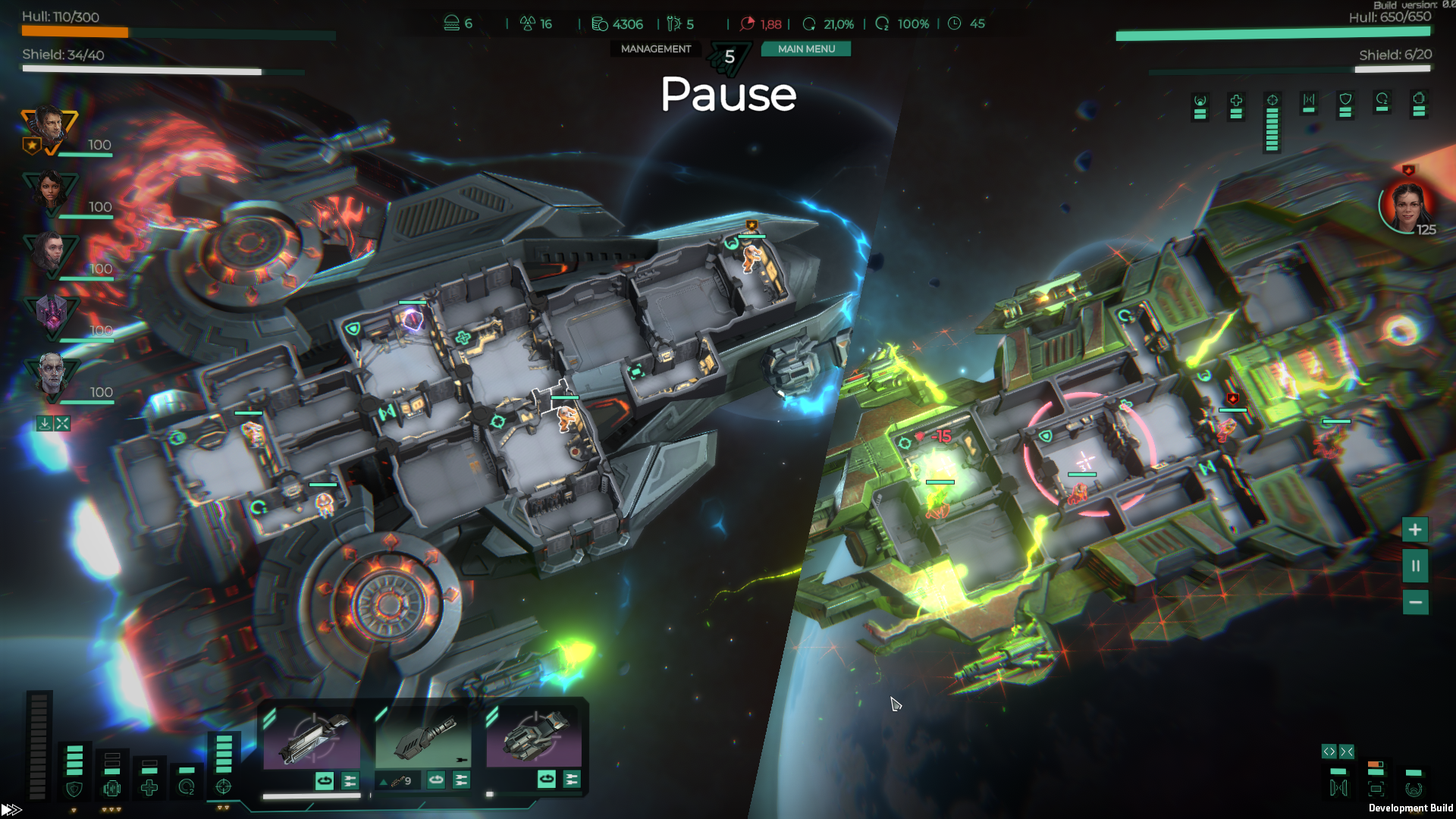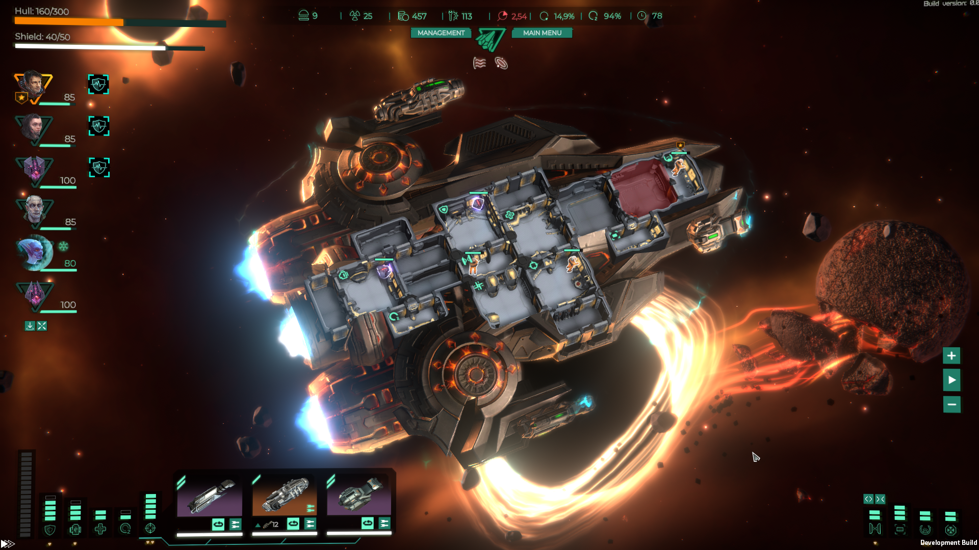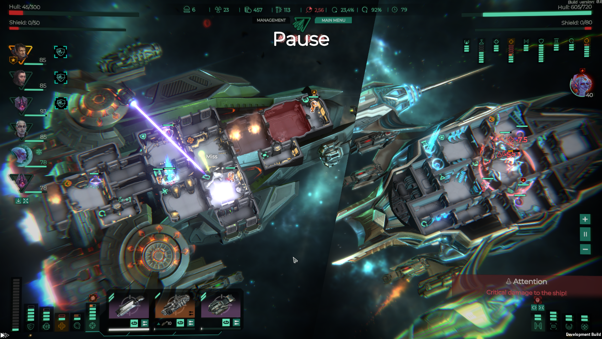 ???? On the game scene in the interior of the ship, we no longer show the Doors HP until they start breaking. This made it possible to set accents and focus the player on the indication of the state of the Systems. ???? Added outlines to all interactive objects in the scene. Doors, Units, Systems are now highlighted on hover. This reduced the number of misclicks. ???? Added a blinking effect when taking damage. It is now easy to see which Unit or Door is receiving damage in the game scene. ???? We've reworked all health bars. If earlier all of them were white. We have introduced color indications green, yellow, red. That made it much easier to understand the situation even with a cursory glance. ???? Changed the work of the scale showing the state of the Shields. Finally, it is clear what happened to them. Level, overload, overcharge, etc. ???? The state of the enemy ship. Previously, it was only two bars of HP and Shields and it was impossible to understand whether you broke the weapon System or not. Now, this is not a problem. ???? Many other changes to make the game easier to control. From a more visual state of the player's weapons to the reworking of all pop-ups. [b]We still have a lot of work to do to improve the UI and we really hope to get your feedback on this. In addition to the main screen for release, we will rework the Ship Management and Space Station screens.[/b]Features