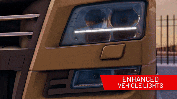 Our MAN and Scania truck's headlights have been completely remade in 3D! All vehicle headlights have been remade to now have daytime driving lights for better visibility on the road. All vehicle and trailer brake/reverse lights now light up the environment. Trucks and trailers have received more marker lights for brighter and cleaner looks. We hope you love the new looks of our vehicles and trailers!