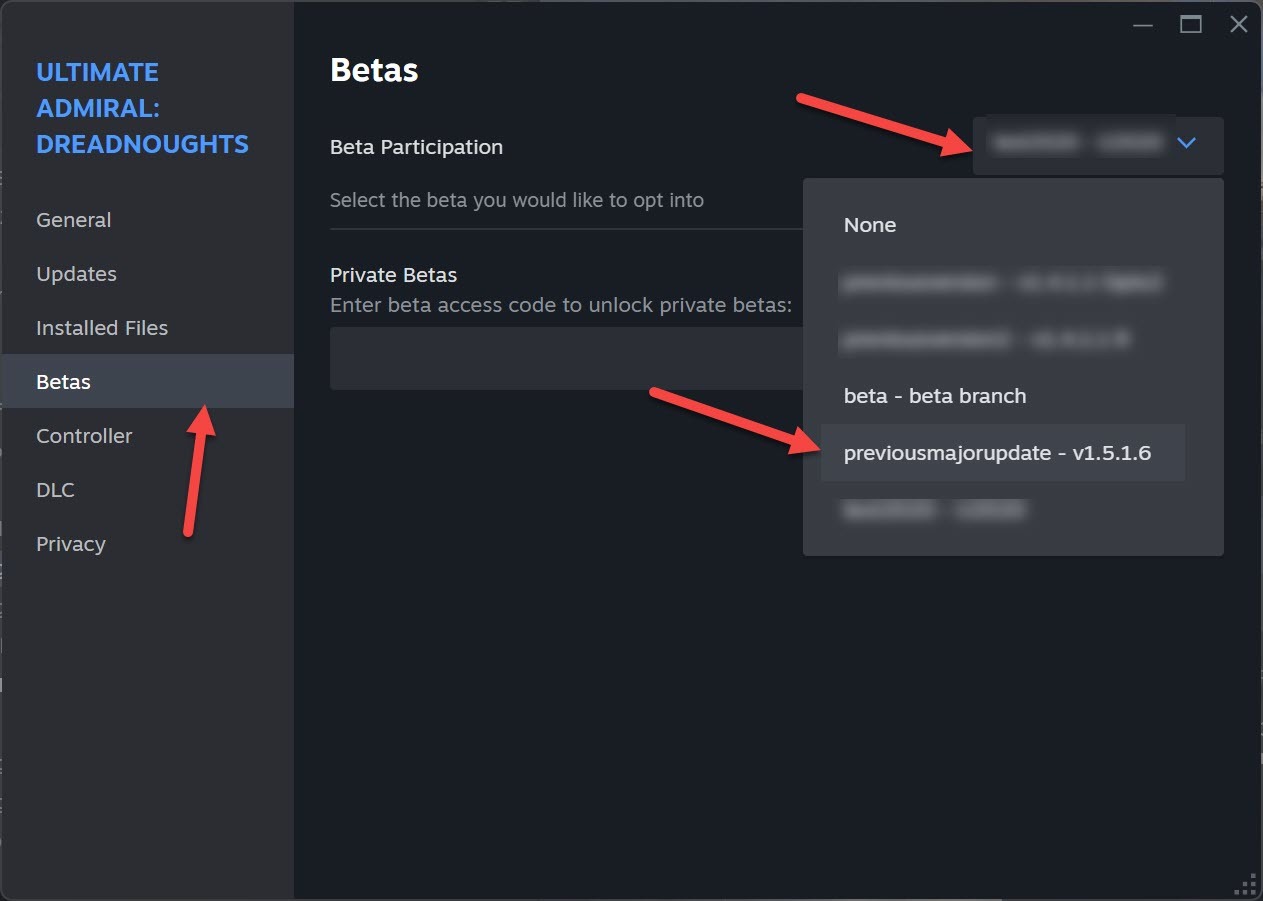 In the Betas section choose the previous version you want. You can switch to "None" to play the latest version.