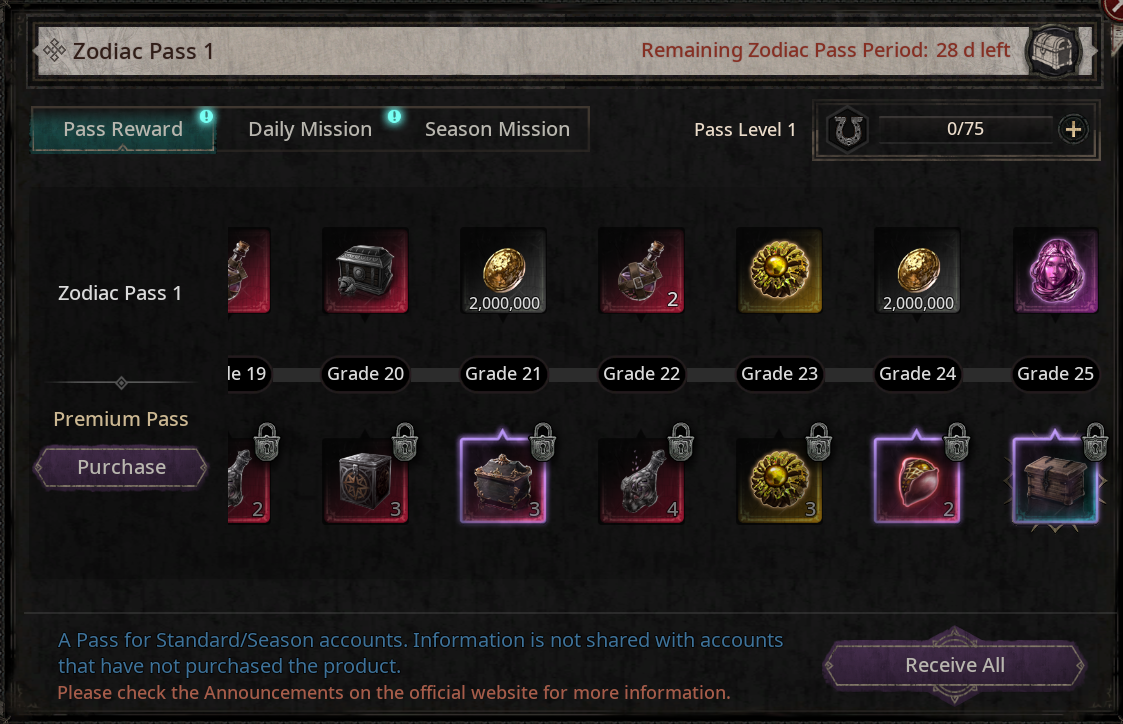 - You can purchase the Zodiac Pass with your account from Standard or Season Mode.