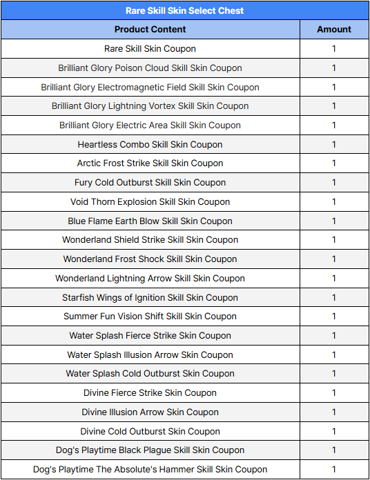 ※ You can select and obtain either a 'Rare Skill Skin Coupon' or a Rare Grade 'Exclusive Skill Skin Coupon' if you use the Rare Skill Skin Selection Chest.