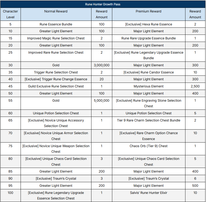 - Rune Hunter Growth Pass rewards start from Lv. 5 and go up to Lv. 100, increasing by increments of 5 levels.
