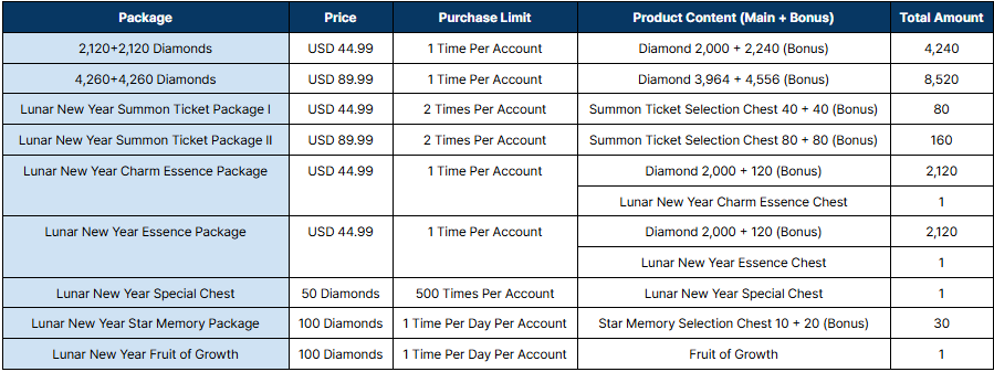 ※ Contents of Lunar New Year Summon Ticket Packages do not include Diamond.