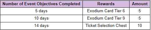 ┗ Example: Complete 10 event objectives = Exodium Card Tier 6 x5 and Exodium Card Tier 9 x5 will be given.