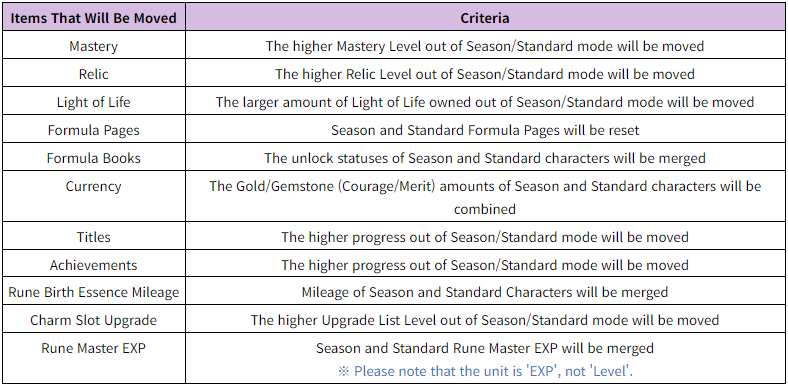 Your Relic Level and EXP, and any Light of Life that you own, will be combined based on whichever values are higher out of Season/Standard mode.