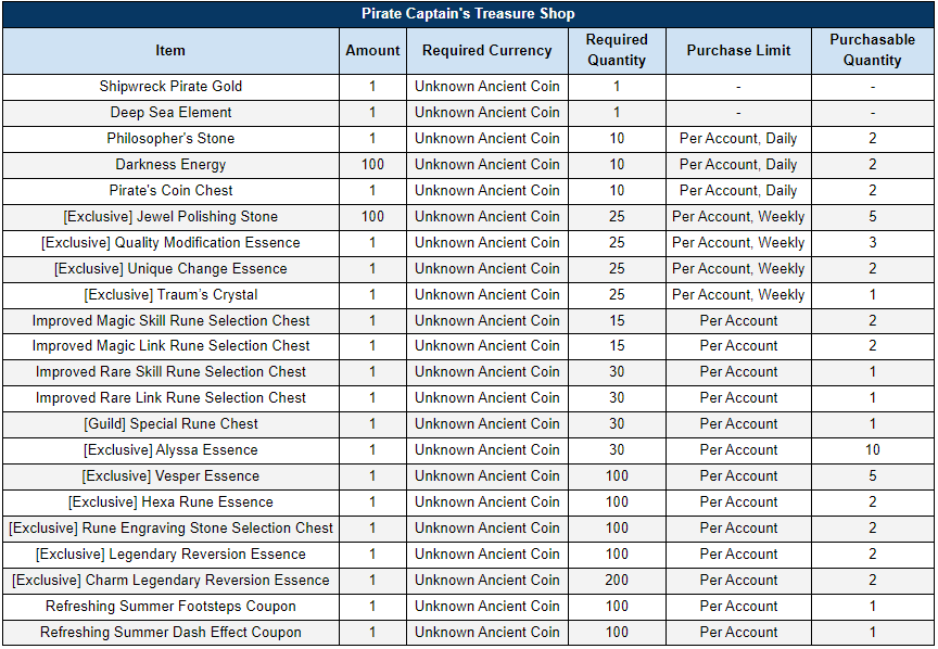- 'Unknown Ancient Coins' can be exchanged for various rewards through the NPC 'Pirate Merchant Jack' in each town.