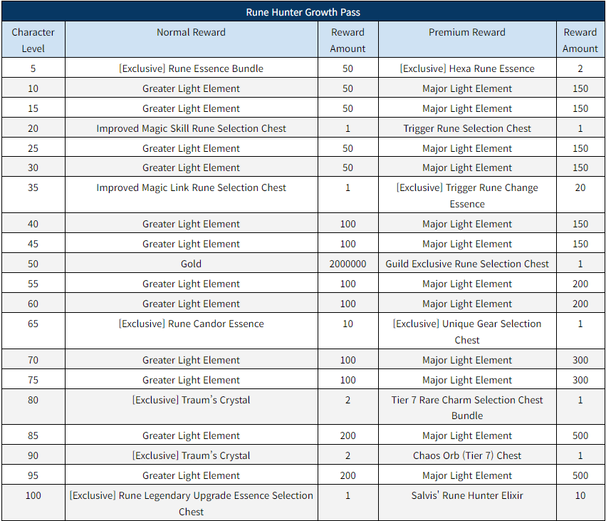 - Rune Hunter Growth Pass rewards start from Lv. 5 and go up to Lv. 100, increasing by increments of 5 levels.