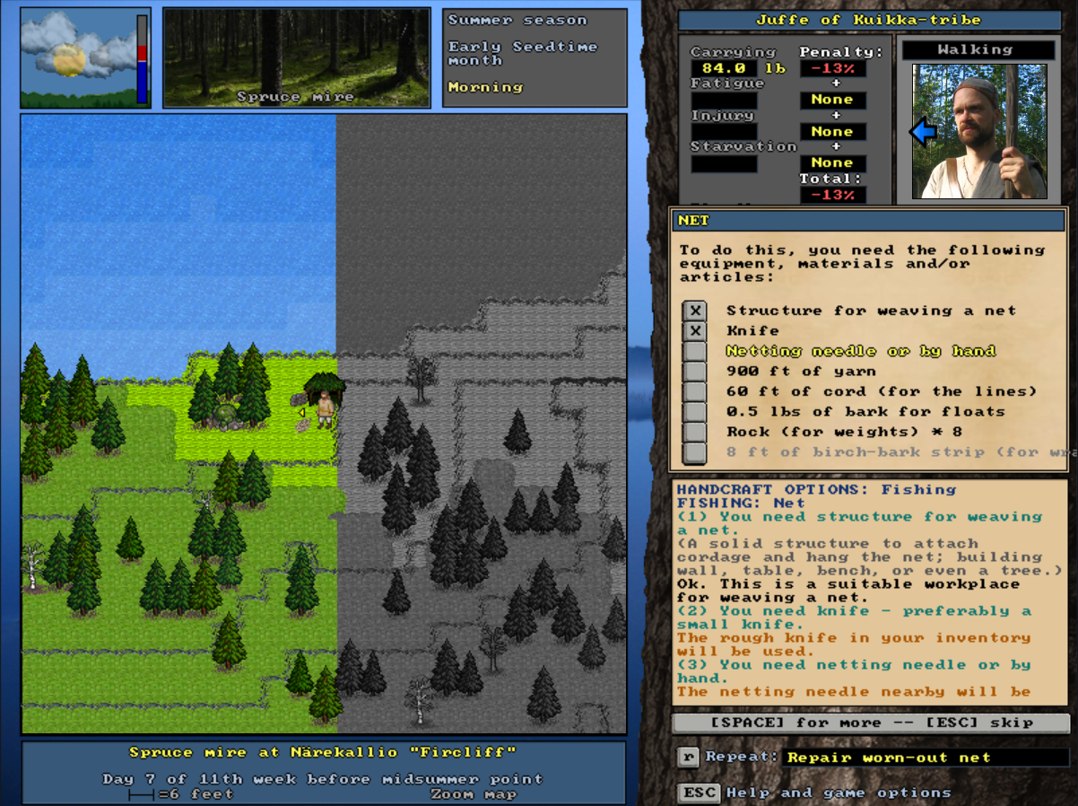 Now it's possible to both craft a net from the scratch, and to repair worn-out nets. These are both pausable tasks allowing you to finish them in parts as you please. This will be the start of featuring a possibility to have breaks in long crafting tasks and continue at will later on. After the mechanics have been developed further this will be expanded to cover wider range of crafting.