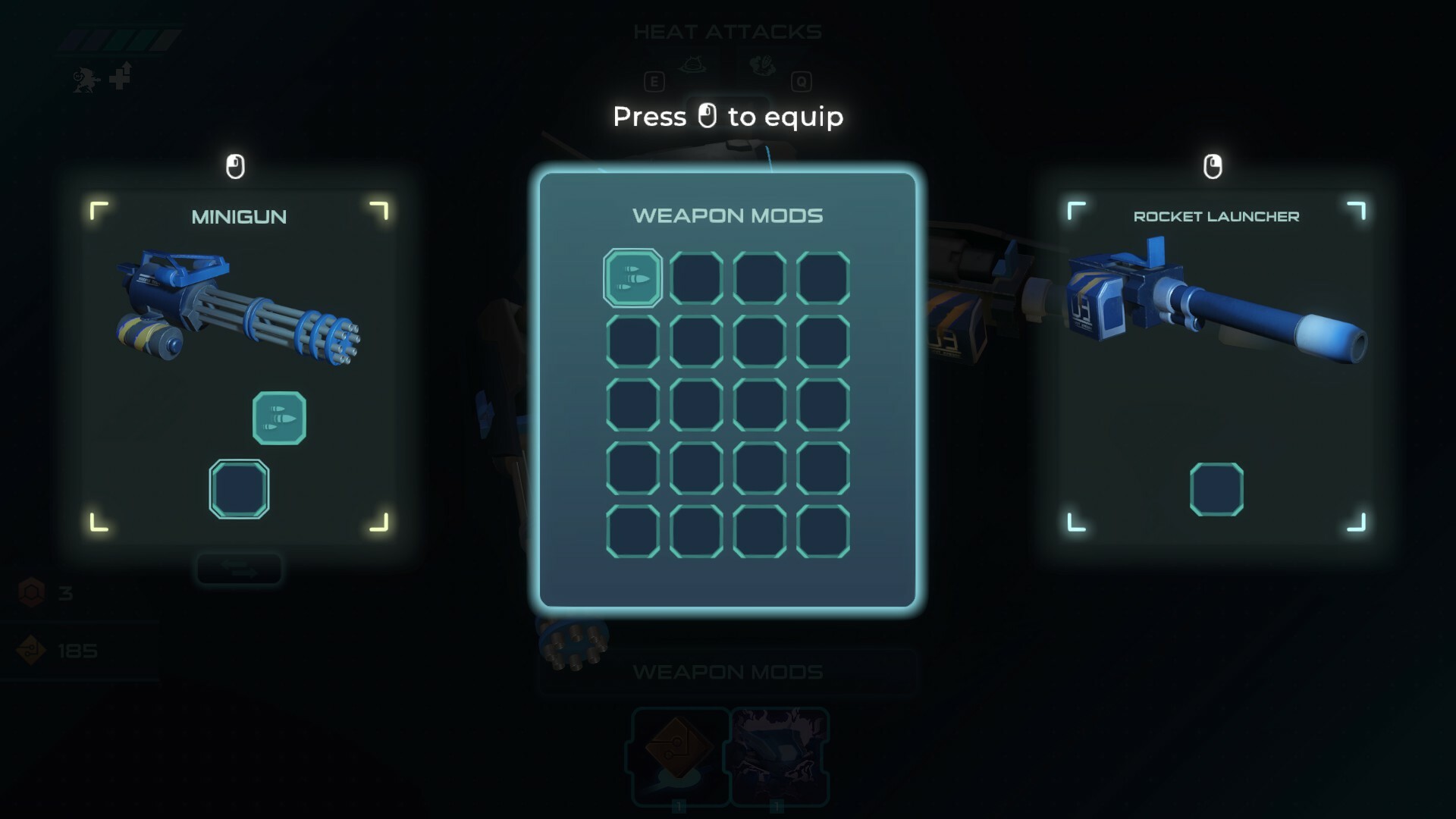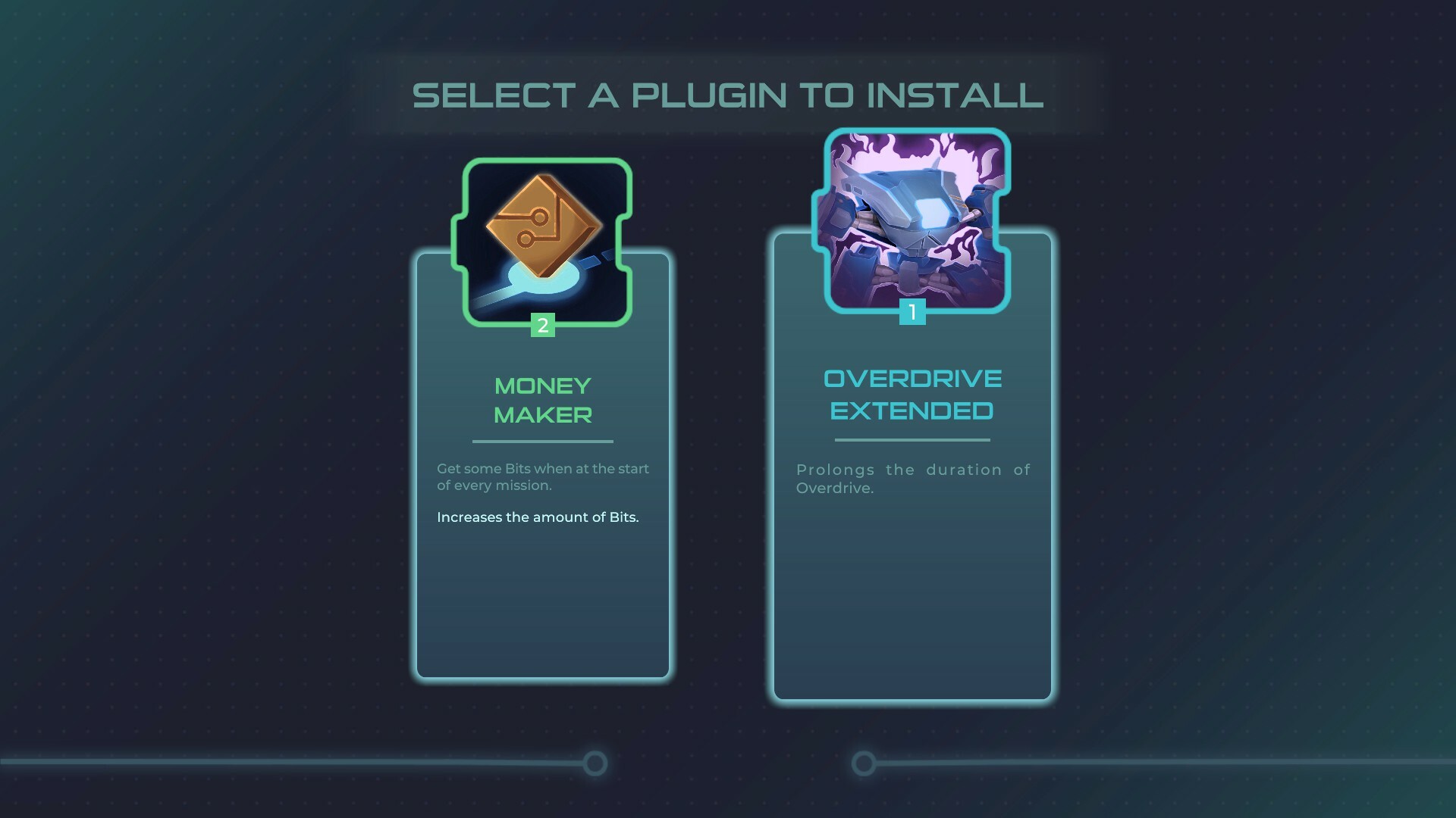 During a run, the mech unit can be improved in different ways. Plugins will add new skills or improve some of the stats. They can be levelled up for an even stronger effect. Additionally, weapon mods are special effects that can be equipped on weapons with available slots. Experiment with their effects on every weapon type and combine them to create your favorite build. More than one weapon mod of the same type can be stacked to increase the intensity of the effects.