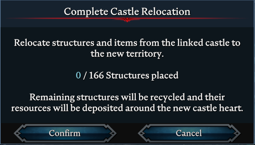The process is fairly simple. Place a new structure we’ve made that will act as the castle heart in your relocated castle in an unreserved territory, then interact with it. You can now connect that heart to a real castle heart that you have ownership of.