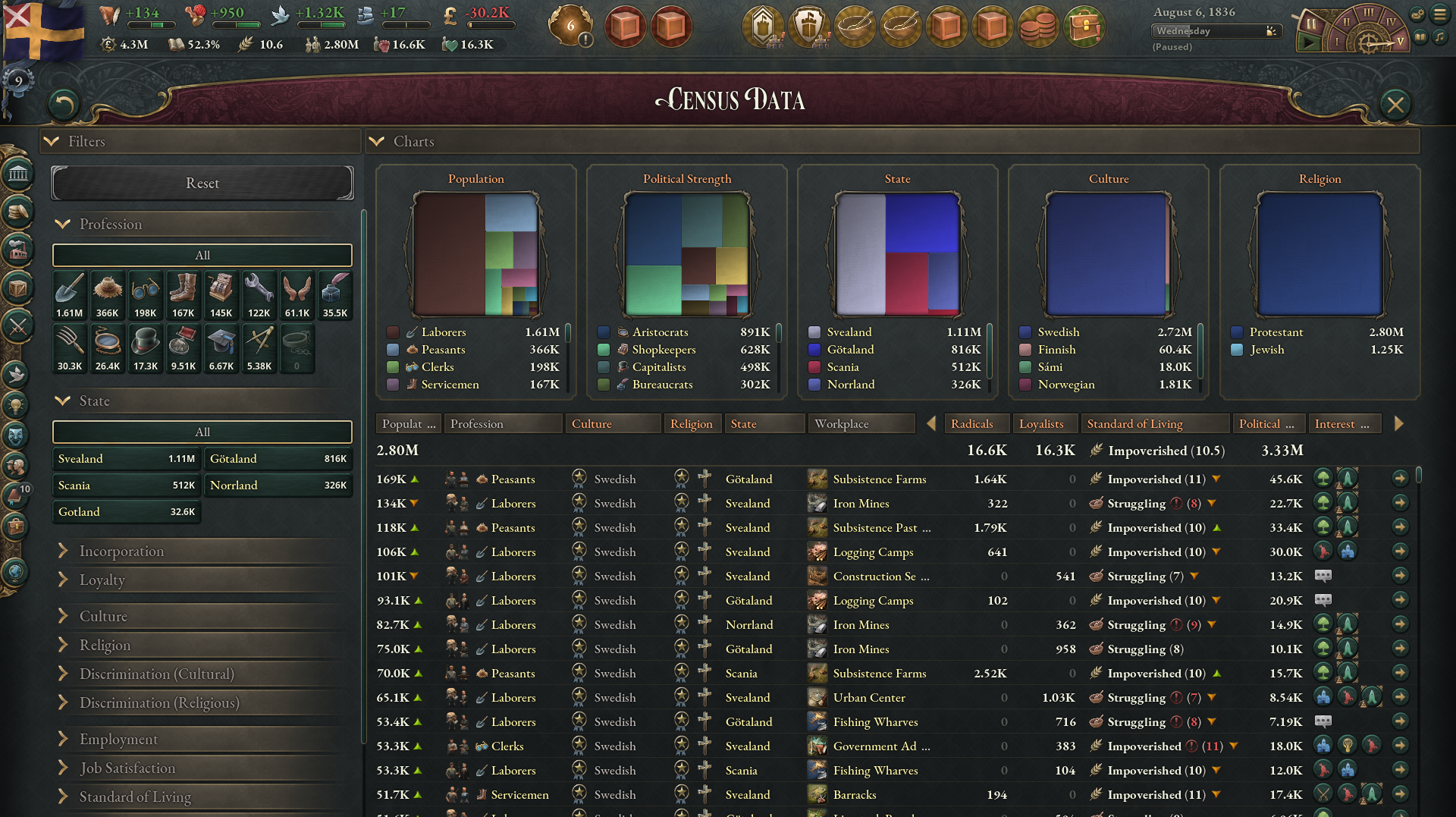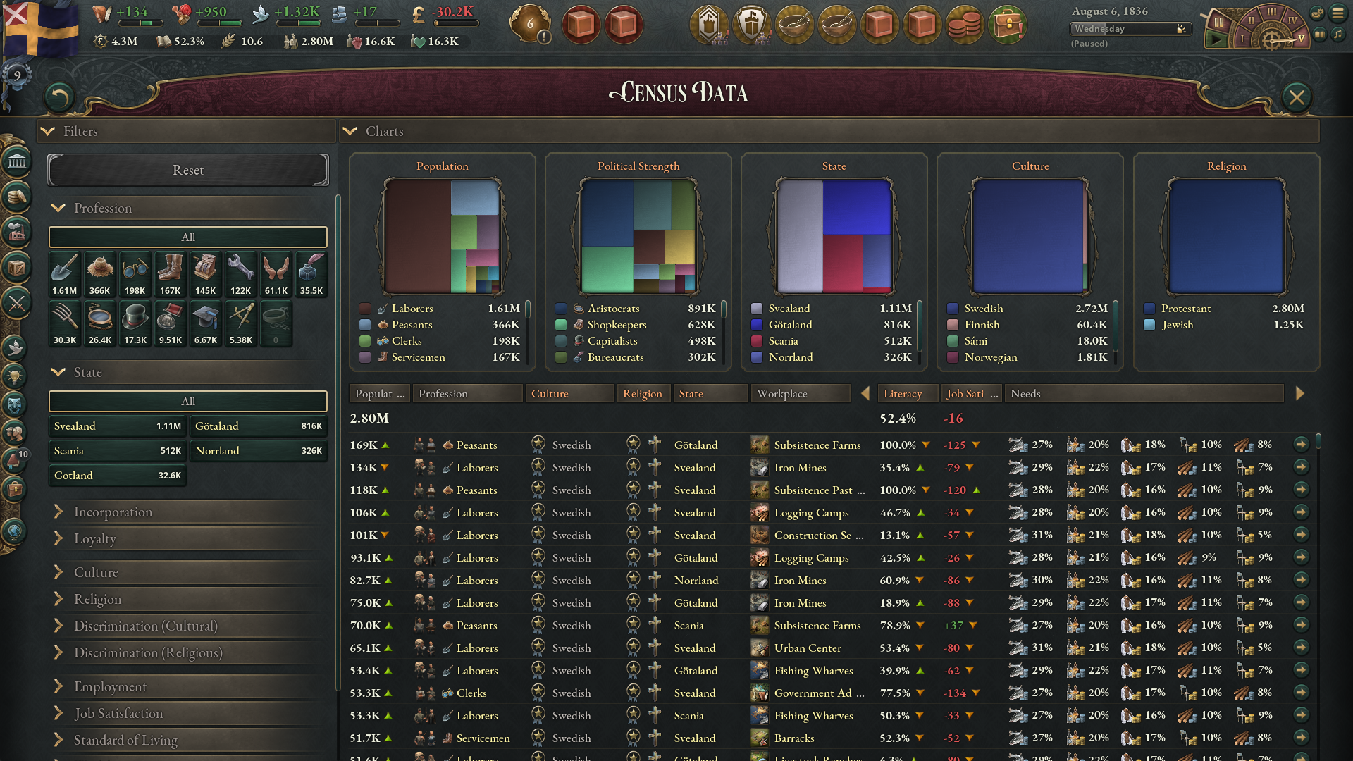 In the previous Dev Diary we introduced the Pop Browser (which has been renamed to the “Census Data” panel, based on a suggestion by forum user Buladelu). Since then we have also added Literacy, Job Satisfaction and Needs as columns in a second “page” in the spreadsheet. The common suggestion of visualization of Interest Group membership sadly had to be postponed to a later date due to implementation difficulties and performance concerns. You can of course still see which pops are part of an Interest Group through the Population tab and on the relevant Interest Group details panels, like before. For upcoming updates we are looking at the feasibility of implementing similar screens for other central types of data, with Buildings, States, Countries, and Goods currently being in the very earliest stages of planning.