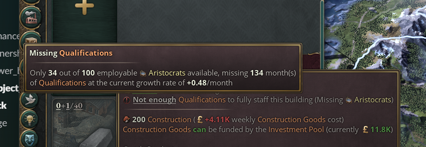 The way we display Qualifications has also received some significant changes. Previously, we would display all Qualifications for a particular profession in the State Panel, regardless of whether the Pops that held those Qualifications actually had any real chance of becoming that Profession. For example, your Capitalists might very well have tons of Machinist qualifications, but it’s not too likely that they are going to quit their jobs and make the switch from factory owner to factory worker. Adding to this confusion, the ‘Insufficient Qualifications’ warning when constructing a building or changing a PM would only look at Qualifications among Peasants and the Unemployed, meaning its predictions would often not play out that way in practice.