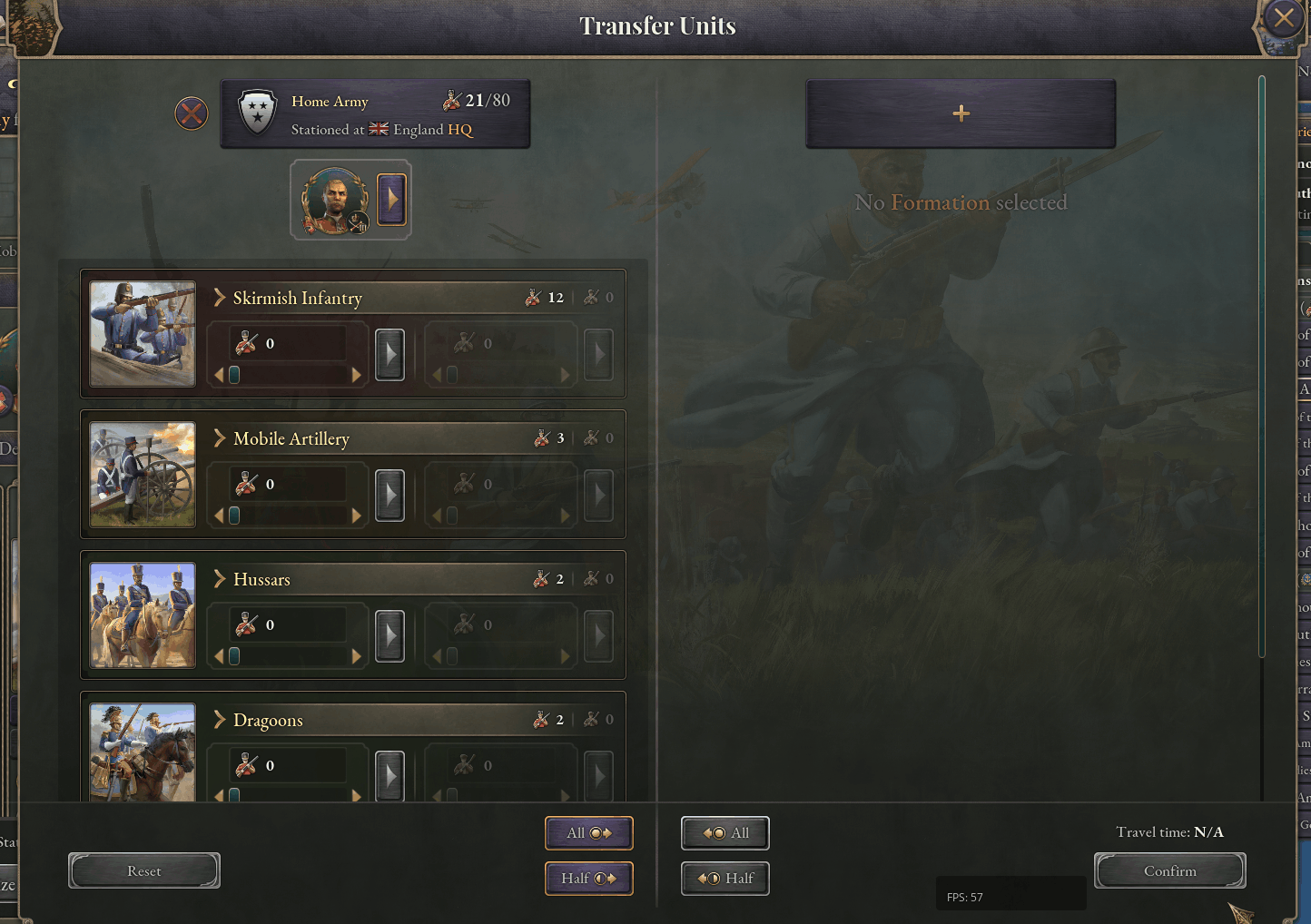 The Transfer Units panel has gotten some extra functionality compared to what is currently available in 1.5 based on many requests from our players. First and foremost, you can now with one quick button press move all or half of the Units and Commanders over to the other side. You may of course want to be more detailed when setting up your transfers, something we now provide additional tools for, namely: