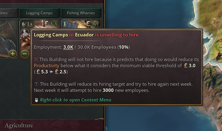 The Employment Indicator has gotten a reworked tooltip that more clearly explains why a Building is able to hire or not.