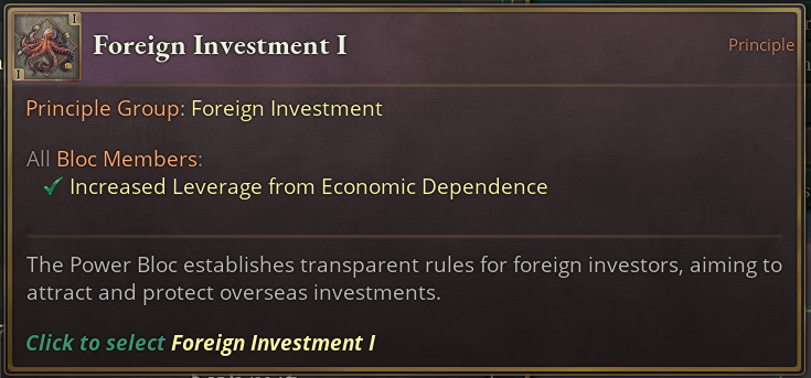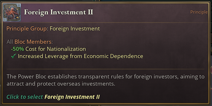 We can see three interesting effects in this group. On the first tier, you will get a higher amount of Leverage from Economic Dependence which, if you recall, is based a lot on how many investments you have in another country which makes them more dependent on you.