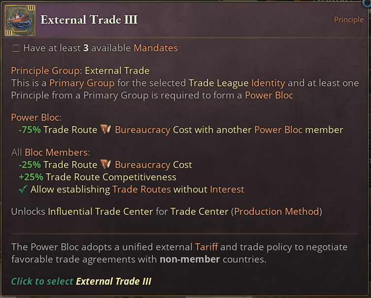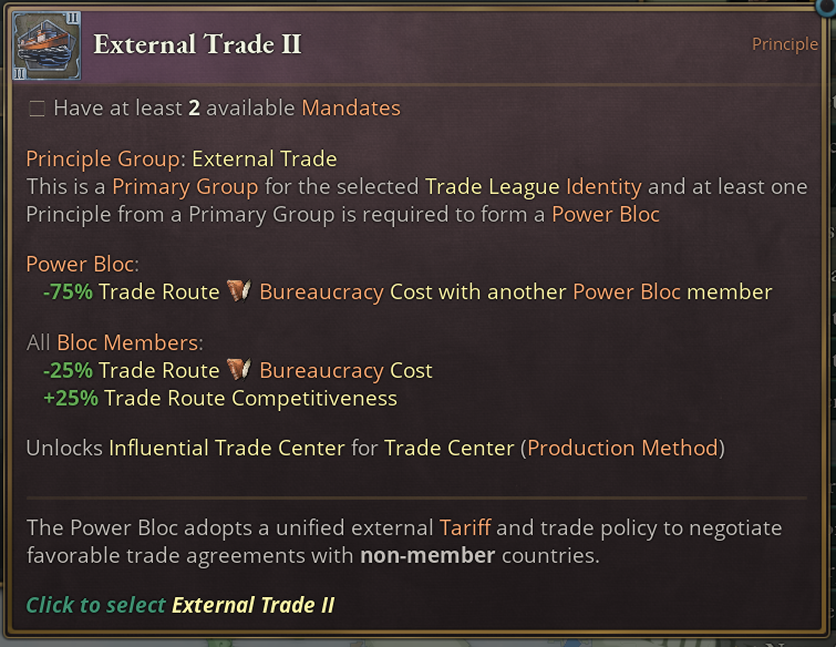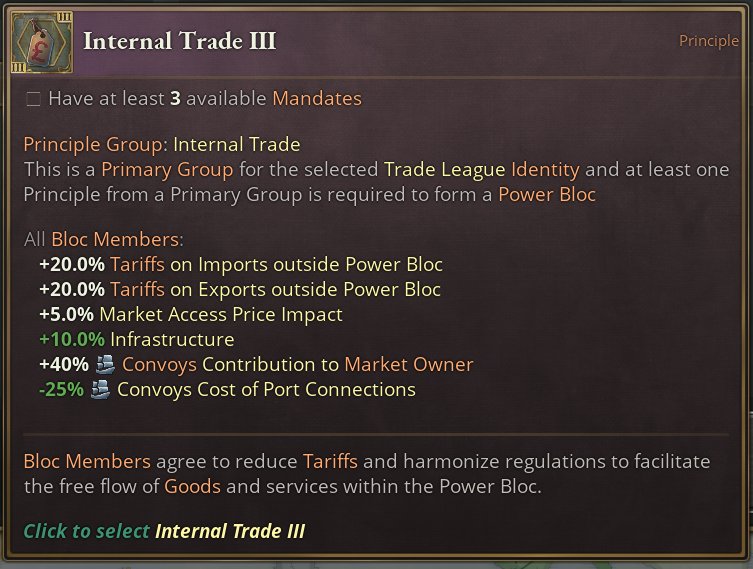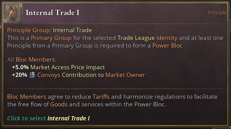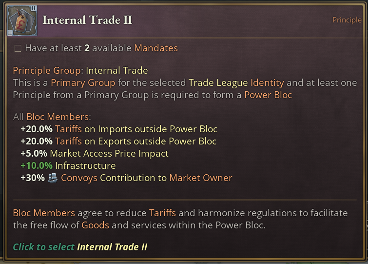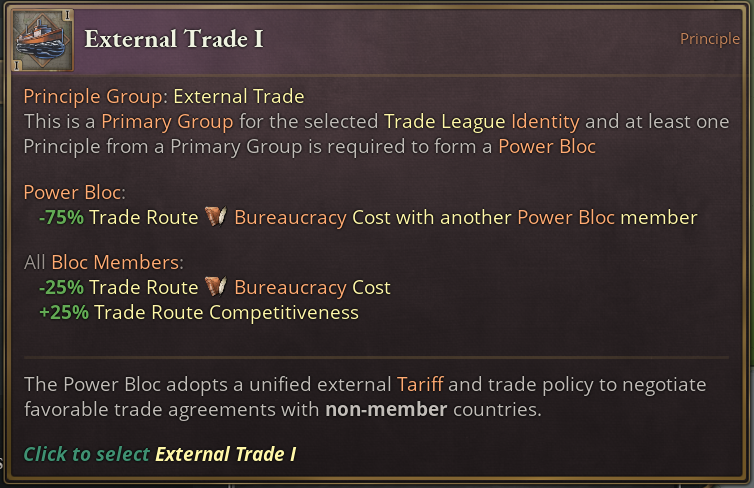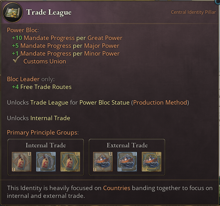 Also the Internal Trade Principle Group is unlocked by this Identity and is in fact one of Trade League’s Primary Principle Groups. One of these Primary Groups is required to be picked from when you first create your own Power Bloc.