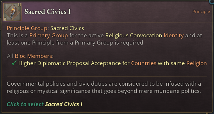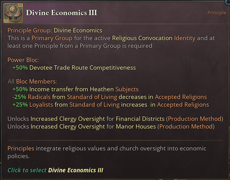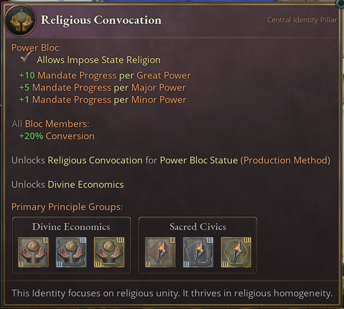 The Religious Convocation Identity also boosts conversion rates in all members, which goes nicely with your power to convert Power Bloc members. For release, we’re supplementing this effect with another one, likely along the lines of reducing radicalism.