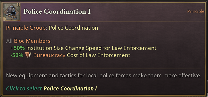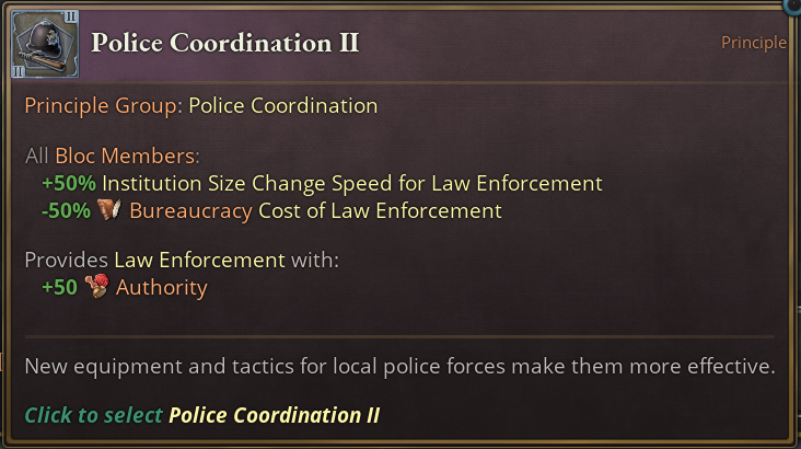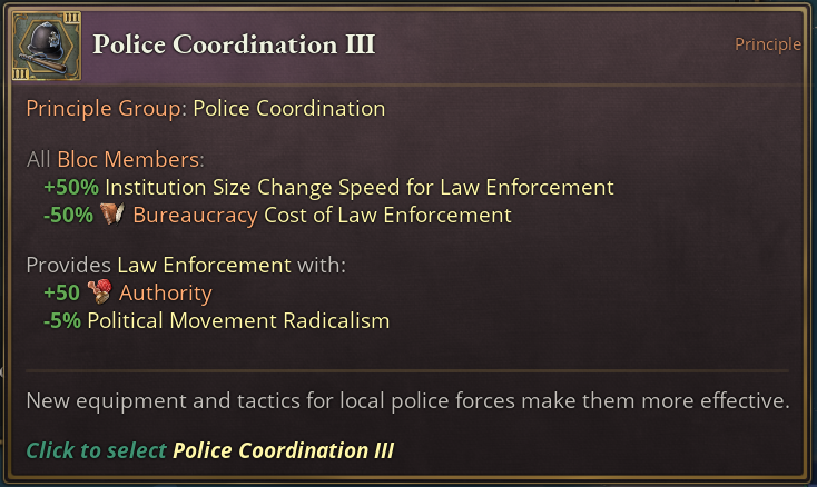 This group provides multiple positive effects for the Police Institution in particular and upgrades its effects. The +50 Authority and reduction in Political Movement Radicalism is applied to each level of the institution. So the deeper you go into this, the more you will profit from it too.