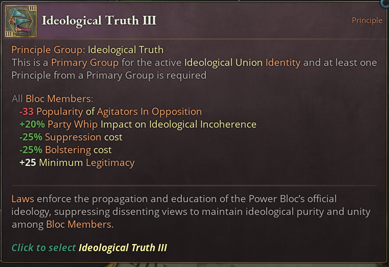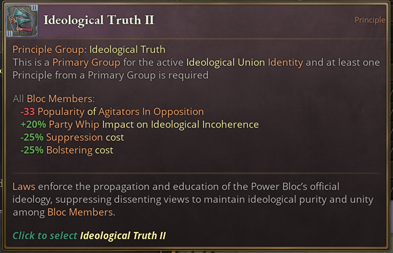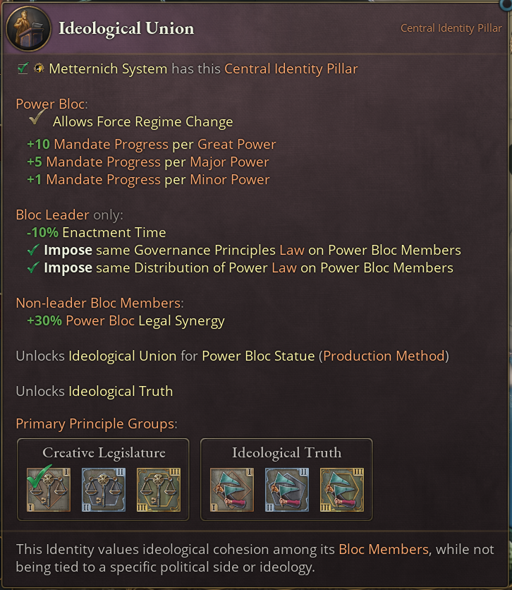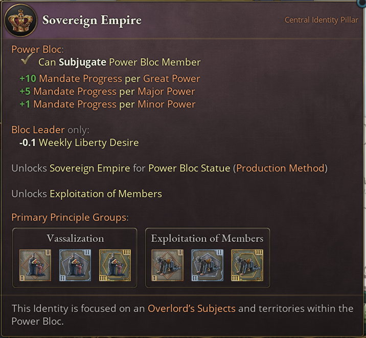 Additionally, choosing this Identity reduces the weekly Liberty Desire progress of all subjects that the Power Bloc leader has. Note: The current effect’s description is wrong, it will be updated for release to indicate this applies to their subjects, not themself.