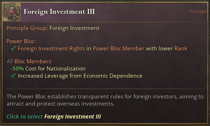 On the last tier, every member of the Bloc gets automatic Investment Rights in other Members of lower rank. This should allow you and other powerful countries to spread your influence inside your Bloc more easily, which in turn makes it more likely for the lower rank countries to stay inside your Bloc.