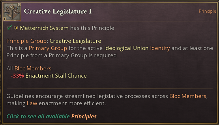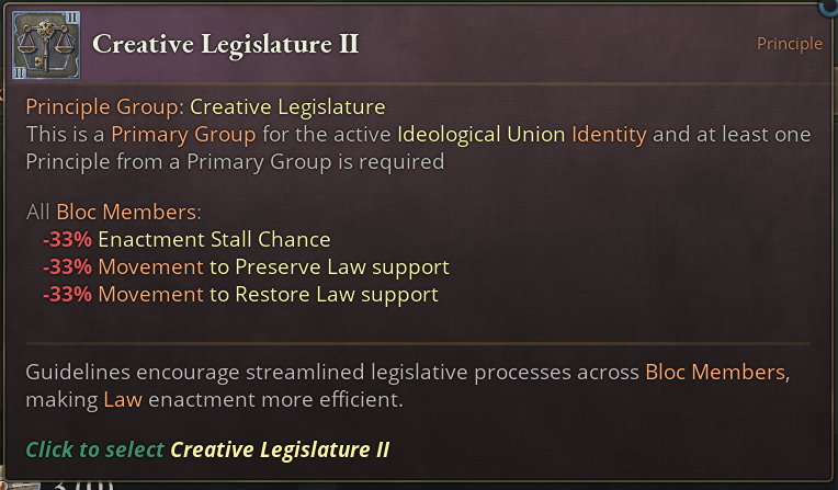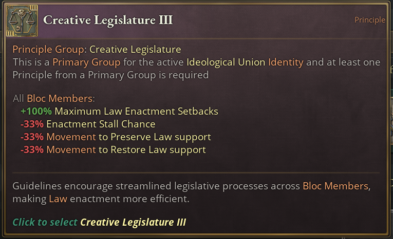For Creative Legislature we see various bonuses to the enactment of laws. It allows you to have more setbacks on the third tier, essentially giving you another roll at it, in addition to the reduced stall chance, making the process proceed faster. Also, it reduces Movement spawn chances that would undo the work you are trying to do with the enactment of your desired law.