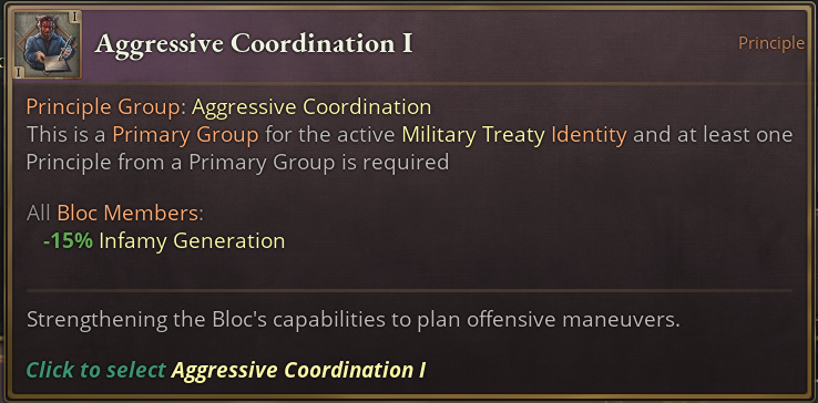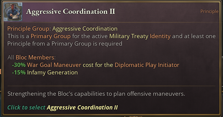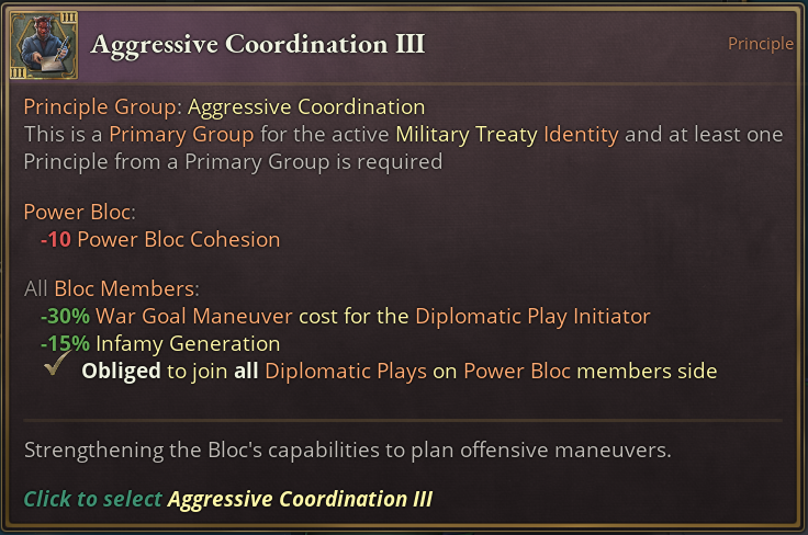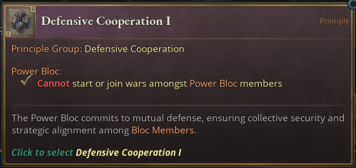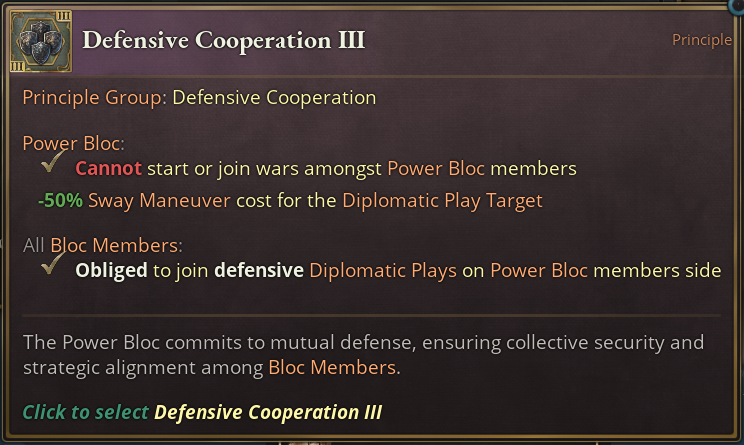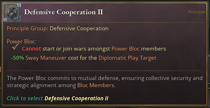 Like most other Principle Groups, Defensive Cooperation does what you would expect. Through mutual commitment, Power Blocs with this Principle are not able to wage war among each other. On the higher tiers, swaying countries gets easier if you’re the target of a play and on tier 3, all members are being forced to join all Diplomatic Plays if a member is being targeted.