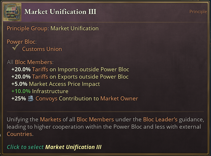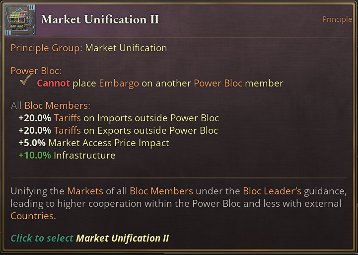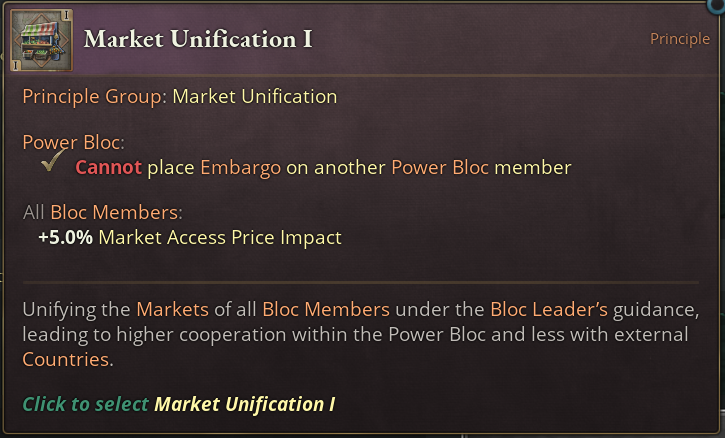 As you can see, the first tier comes with a heavy hitter in the form of a bonus to Market Access Price Impact (also lovingly called MAPI) for all Bloc members.