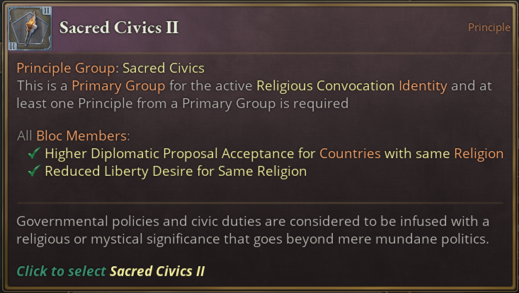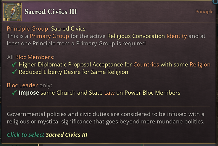 Religious homogeneity is what this Power Bloc Identity strives for. It allows leaders to impose their state religion on other members. It’s an unique Diplomatic Action which will set a member's State Religions to the leader’s. Similarly to other Power Bloc Leader actions, it requires a certain Cohesion and Prestige value and also cannot be used immediately on a new member.