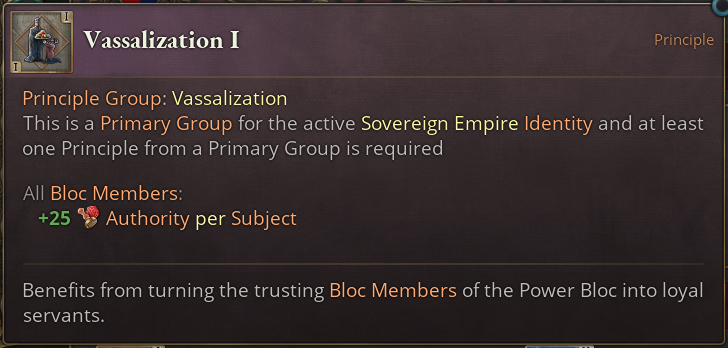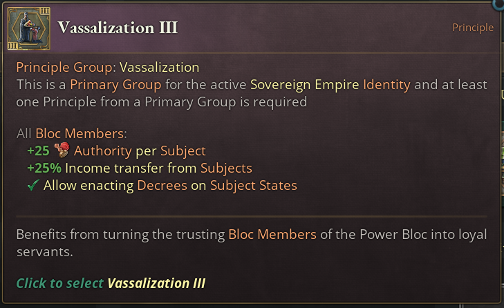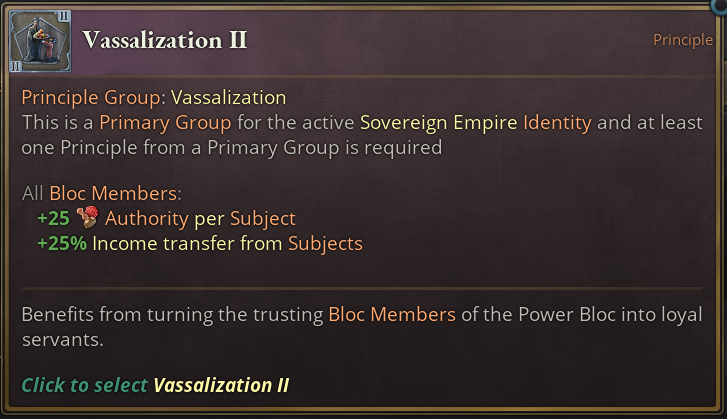 Next up we also have two Primary Principle Groups for the Sovereign Empire. Let’s start with a closer look at Vassalization: