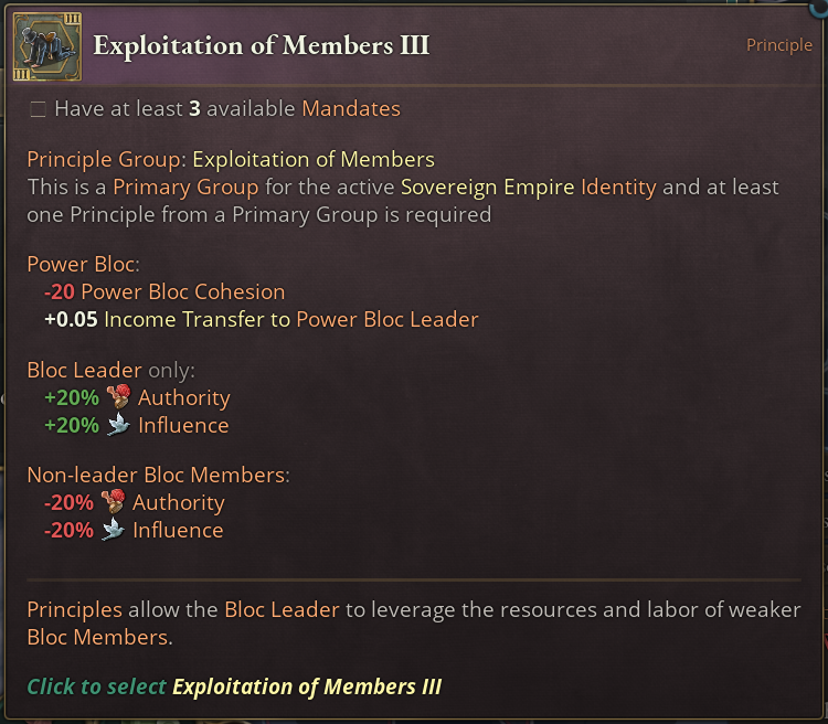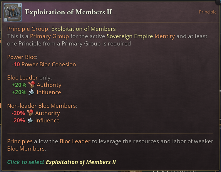 Next is a group that is exclusive to Sovereign Empire Power Blocs, Exploitation of Members: