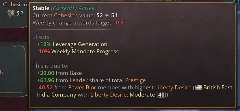 On the other hand leaders get a bonus to Cohesion based on their share of total Prestige in the Power Bloc.
