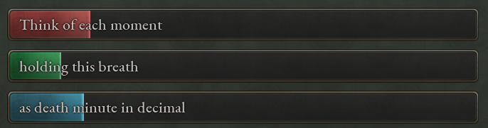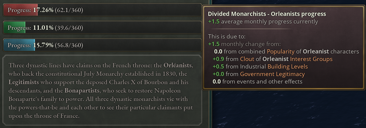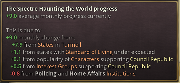 Each scripted progress bar has certain conditions which can change its progress on a weekly, monthly, or yearly basis, and can be changed by means of scripted effect, using the new “add_progress” and “set_bar_progress” effects.